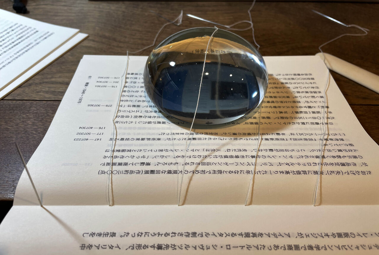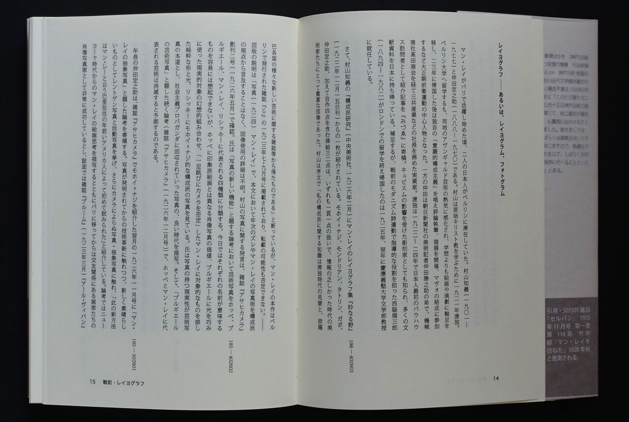 本造りは書容設計が楽しい。原稿量の目処がつき、装幀などを考慮しながら、細部を調整していると、マン・レイと一体化した感覚に包まれる。──「もの造りの人」になれるのです。今回の『マン・レイと日本1926~2022』では資料編が基本で、テキストは補足、別添したエフェメラ類を五感に訴えるスパイスとした。当初は三分冊を予定したが、これをするといずれ書物は泣き別れ、縦書きと横書きを合体させると居心地の悪さが残る。製本の制約から最大288頁、読み物ではなく資料とする為のコデックス装。インデザインは和文フォント、字詰めに難がある。テストを繰り返し着地点を探った。資料項目の削除は不可、最終段階での新収集品もあり苦労する。結局、エフェメラ編は別とし、一冊に収めるのはテキスト分量で調整、下段に目録番号を付し出典と関連付けた。
