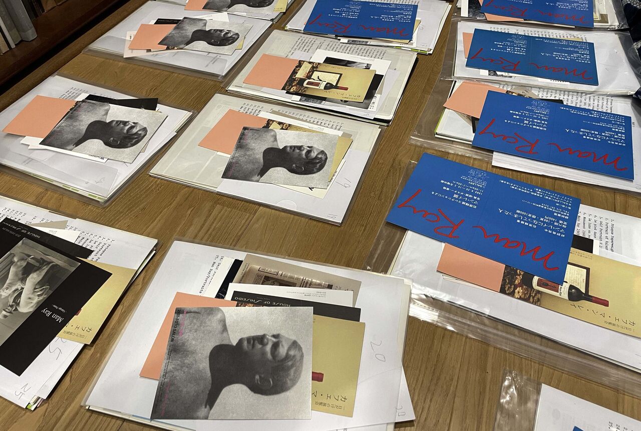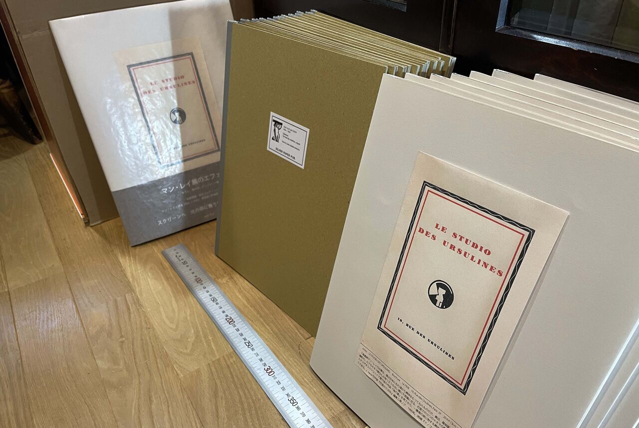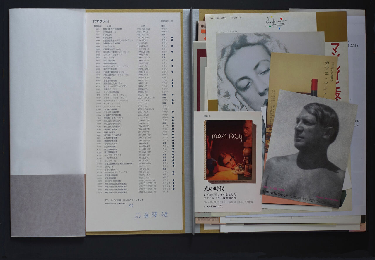 本書ではマン・レイ展を告知したチラシや案内状に加え展示リストなどの現物をフォリオ形式で提供するアイデアを当初から持った。筆者は「物を捨てられない性分」で、特にマン・レイに関する資料となると「裏切り」のような感覚がついて回り、愛でて残してきた。50年続けると相当な量である。それで、複数あるものは「嫁に出す」ことにした。近年、展覧会に関する一次資料の重要性が認められるようになったが、これは展示された事実を時代に繋ぐ錨の役割に多くの人が気付いたためで、「物語」なくして作品は存在しないと強く思ってきたので嬉しい。もちろん、複製品では伝わらない微妙な雰囲気、経年変化の魅力については「分かる人」としか共有できない。だからこそ、筆者はオリジナルを別添したかった。
