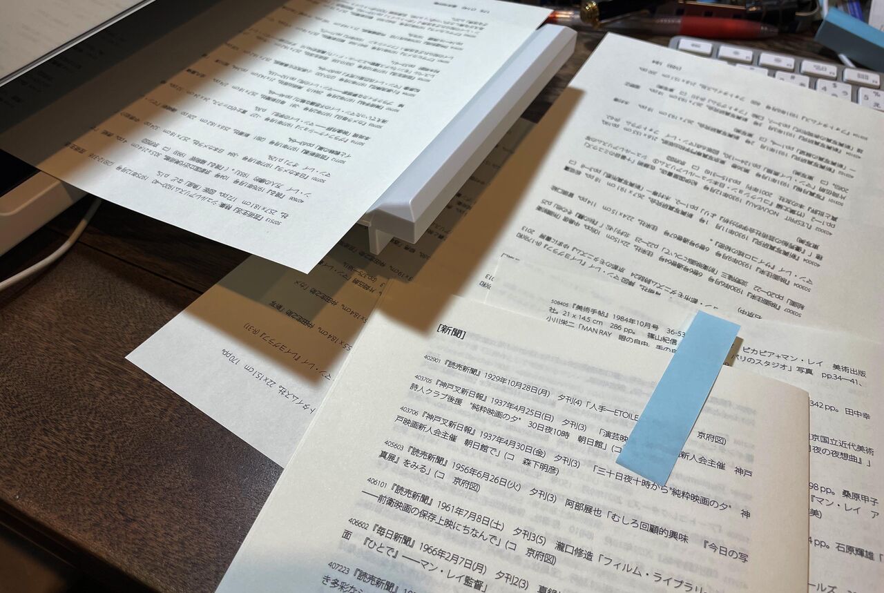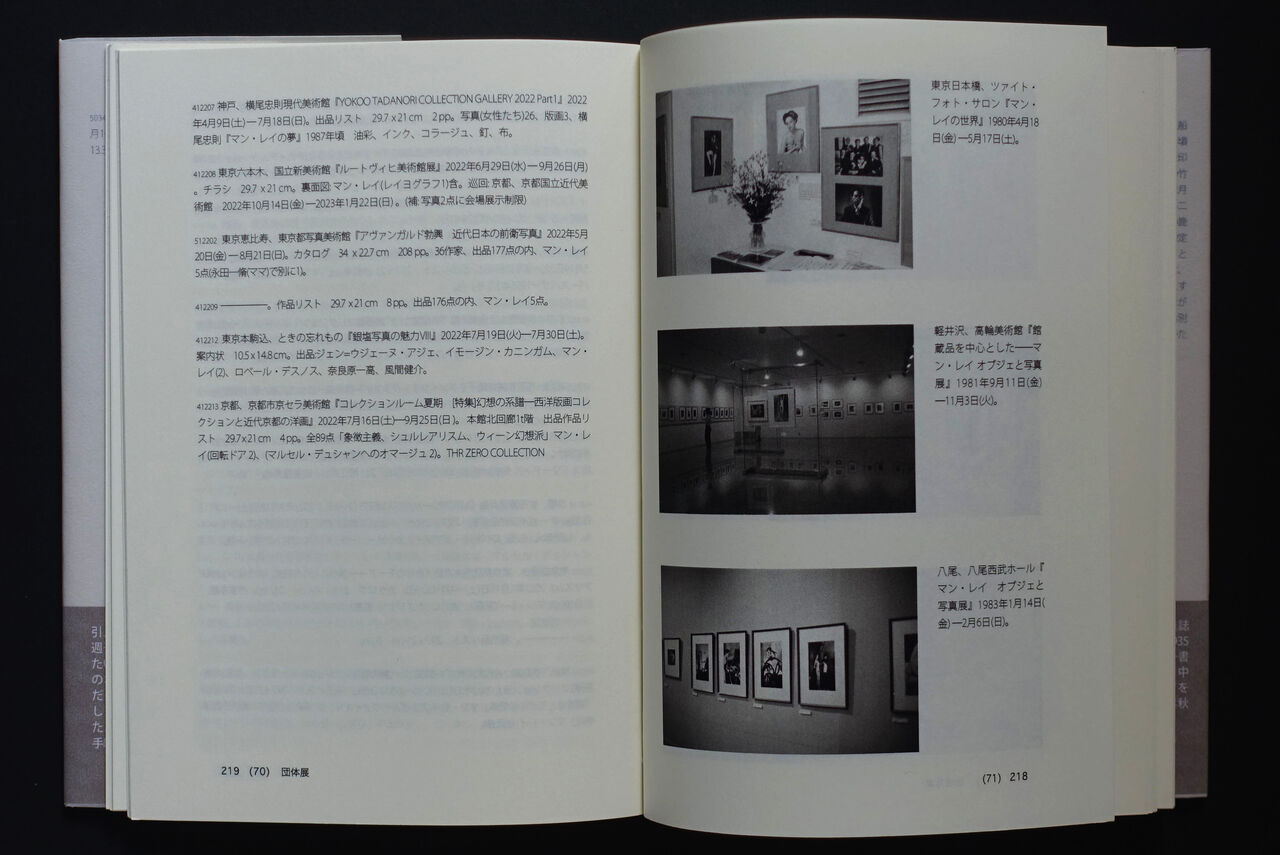 さて、本書の眼目は筆者所蔵の展覧会資料目録にある。当初の京大カードからファイルメーカーに移り、書籍化前提のインデザイン入力は2002年頃からと記憶する。受容史を射程としたレイアウトに基づくものは2019年だったか。コレクター人生の成果を示す長い作業であり、戦前の招来品の再来日や未見資料の登場など、最新の展覧会と過去のそれが交互に続く面白さに我を忘れる事となった。エフェメラ類の高騰に怯えつつオリジナルで揃えたいと無理をする日々、バカだと思う。しかし、珍しい一次資料を手にパズルの欠けたピースを埋める作業は、点から線、線から面へと続き広がるマン・レイ受容探求に寄与してくれた。