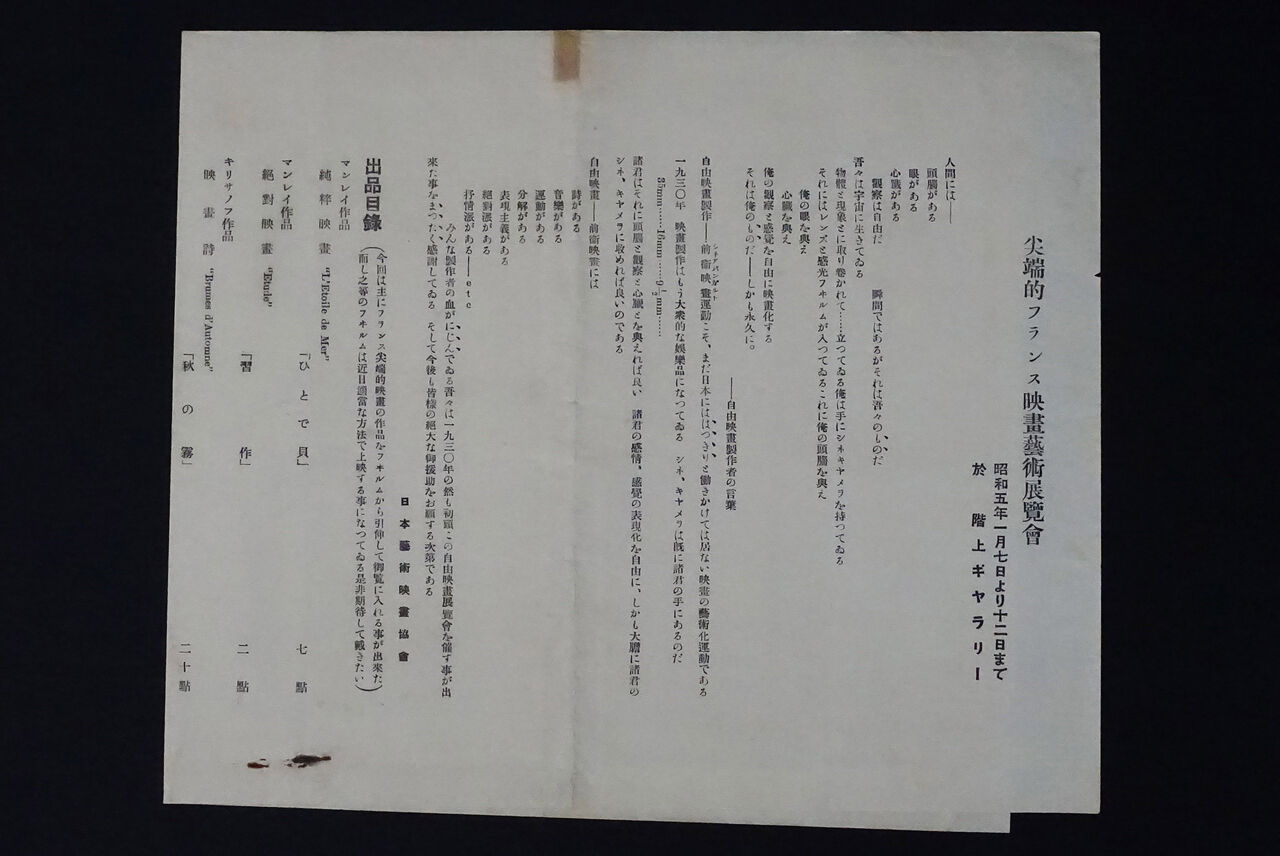 銀座、資生堂美術部階上ギャラリー『先端的フランス映画芸術展覧会』(1930年1月) カタログ(片面刷一枚)。