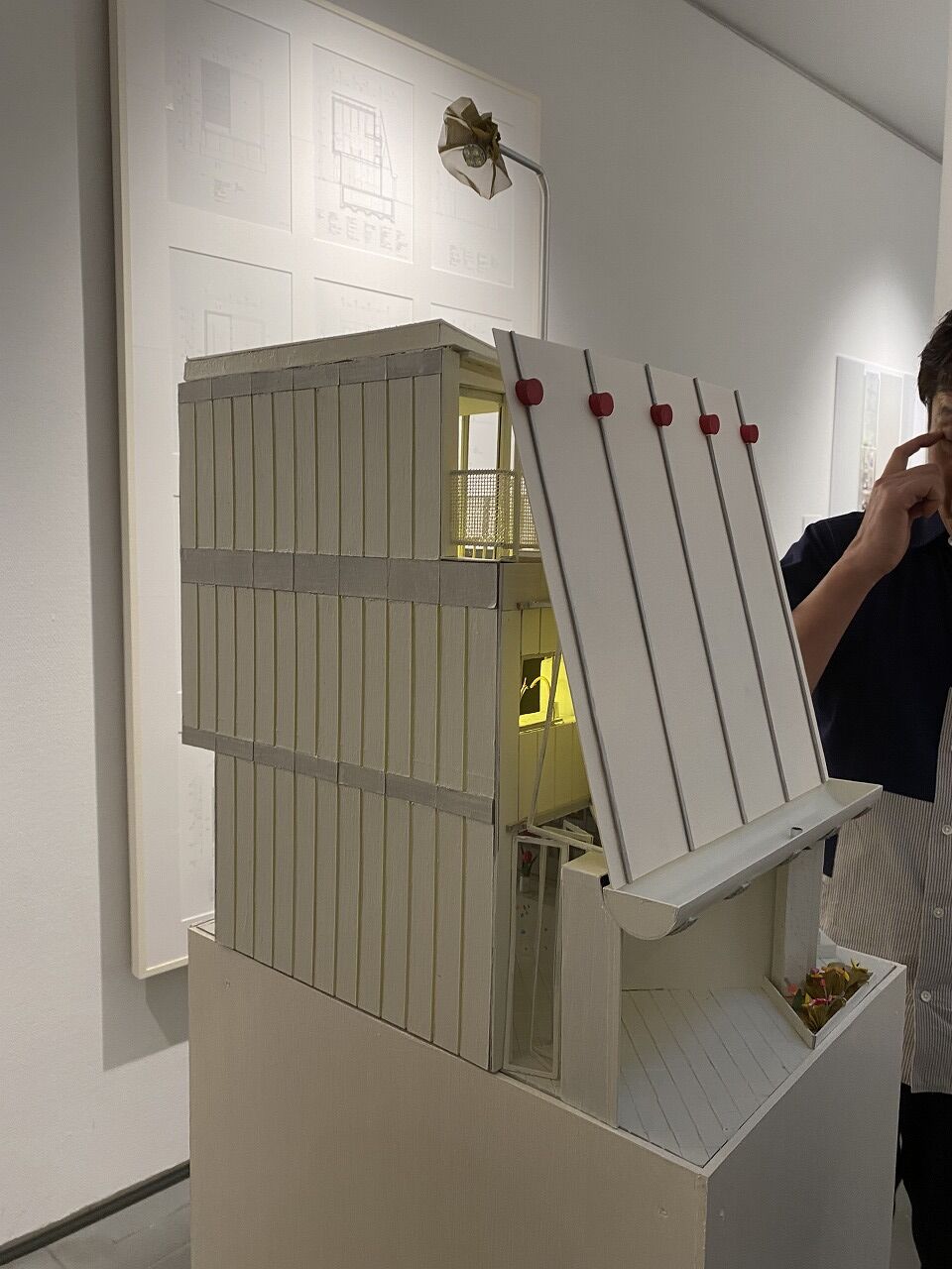 湯浅良介「TEMPO」の模型。TEMPOは店舗とテンポを掛けて、1日を1分で表し、朝が来れば模型の上にある太陽を表している電気が点き、夜になれば室内の電気がつきます。