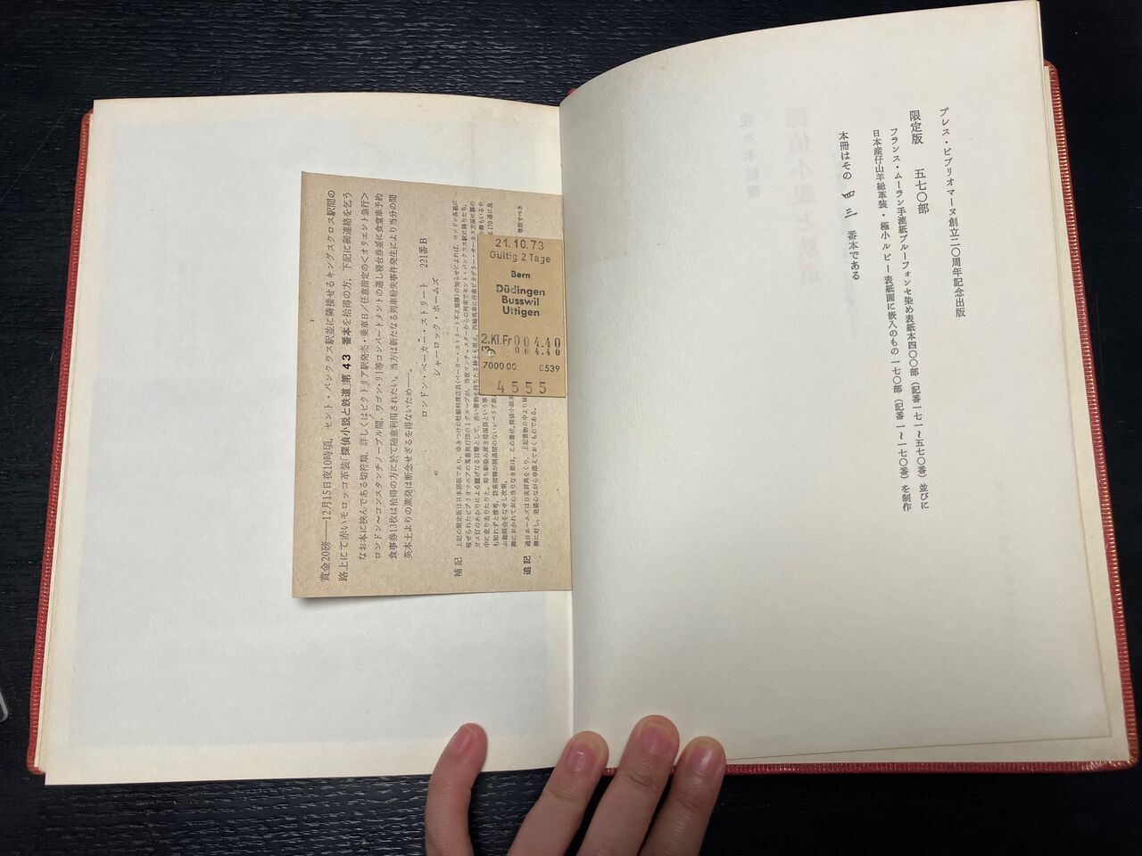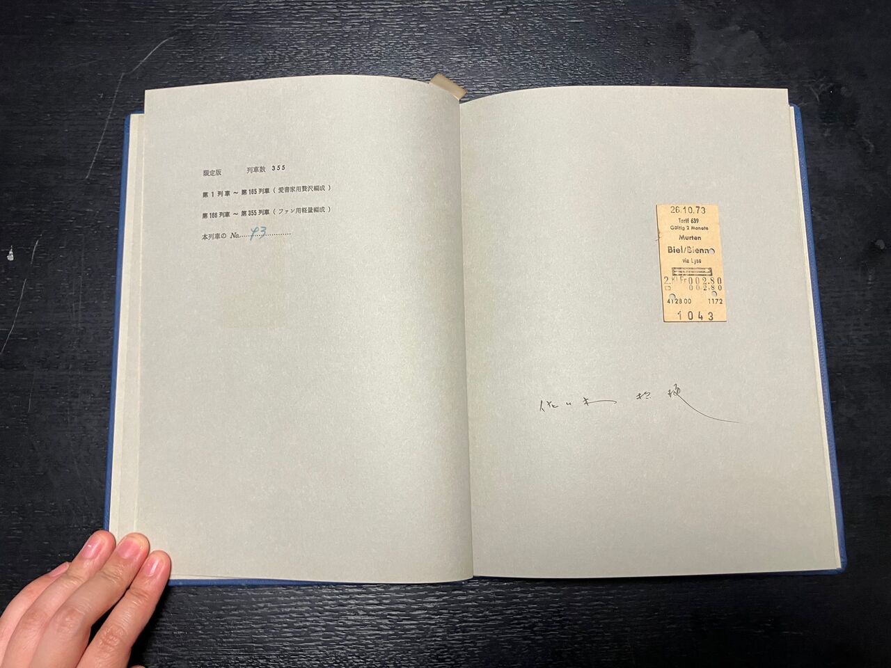ときの忘れものが所蔵するのは限定165部で製作されたという「愛書家用贅沢編成」版の装填。乗車券が貼り付けられていたり、奥付には「レイアウト・構成・運転 佐々木桔梗」のクレジットを見つけたりと、ページをめくるたびに心躍る内容です。