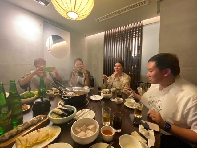 3仁添まりなさんを囲んで火鍋で会食、笑顔が初日の成果を語っていますね。