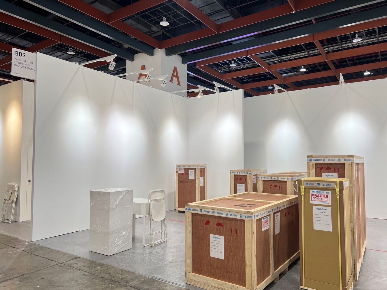 ときの忘れもののブースと、搬入された作品の木箱群。