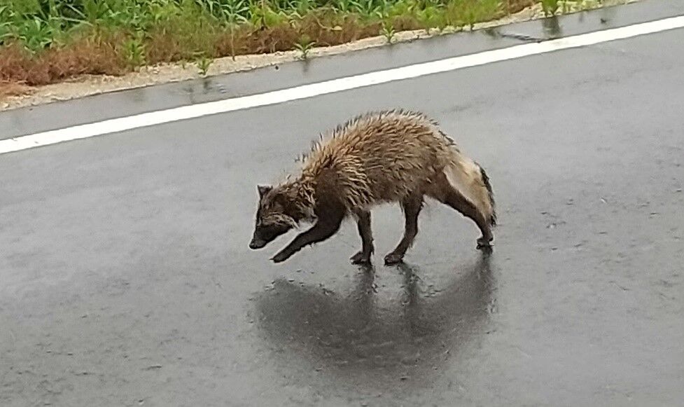 そして、刈谷田川のほとりのいつもの散歩道でよくケモノに遭遇します。その日は暑さと夕立にうな垂れてフラヌールするタヌキでした。