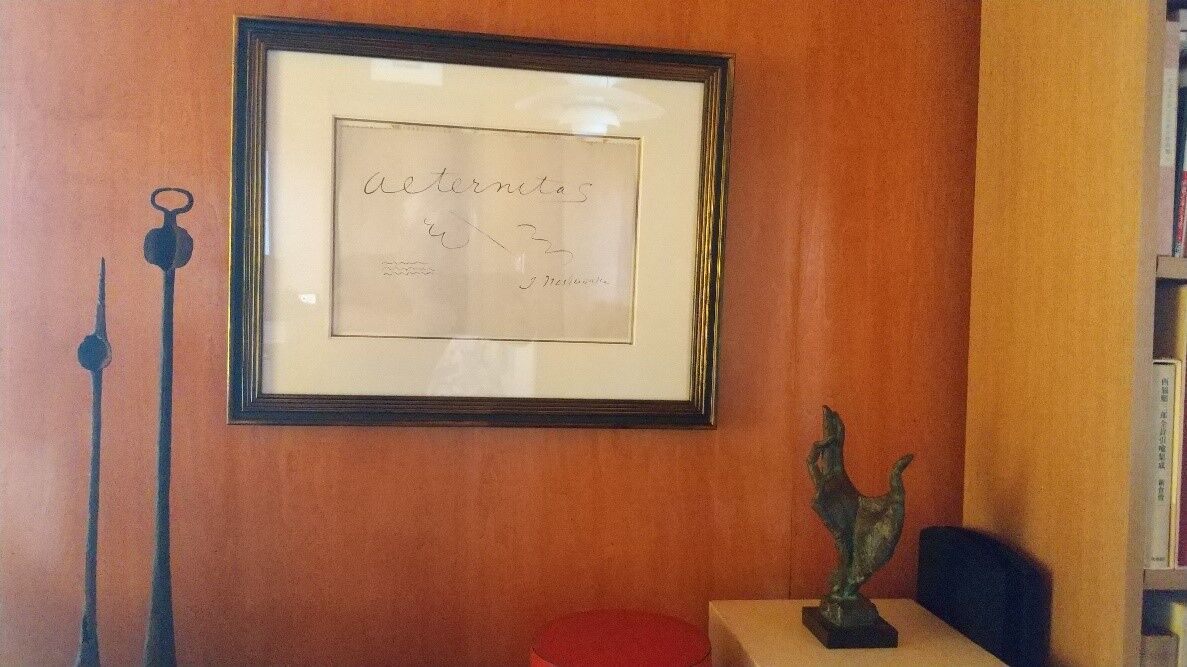 まだ通い始めて間もない頃、私が西脇順三郎の詩集を集めていることを何かの折に話していると、梅野氏が突然と席を立って狭い画廊の奥から、「こんなのがあるよ」と持ってこられたのが西脇のA4大くらいの紙に描かれたデッサンでした。他にも数枚あって、中には北園克衛(1902-1978)のデッサンや写真も交じっていました。聞けば、昭森社 ( 現在は廃業か? ) の社主・森谷均氏 (1897-1969) が故人となられたあと、社から譲り受けたものだというのでした。昭森社は良質な詩集や美術書の出版で夙に有名な出版社でした。西脇順三郎詩集『えてるにたす』( 特装版・普及版1962年12月 ) も昭森社の発行です。この詩集に使われた西脇自身になるデッサン数枚がこの時に梅野氏から見せられたものでした。代金は私の給料日払いということで、いただくことにしました。