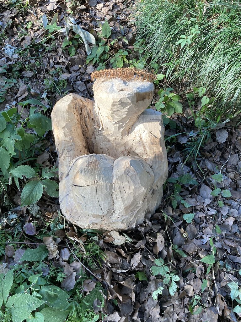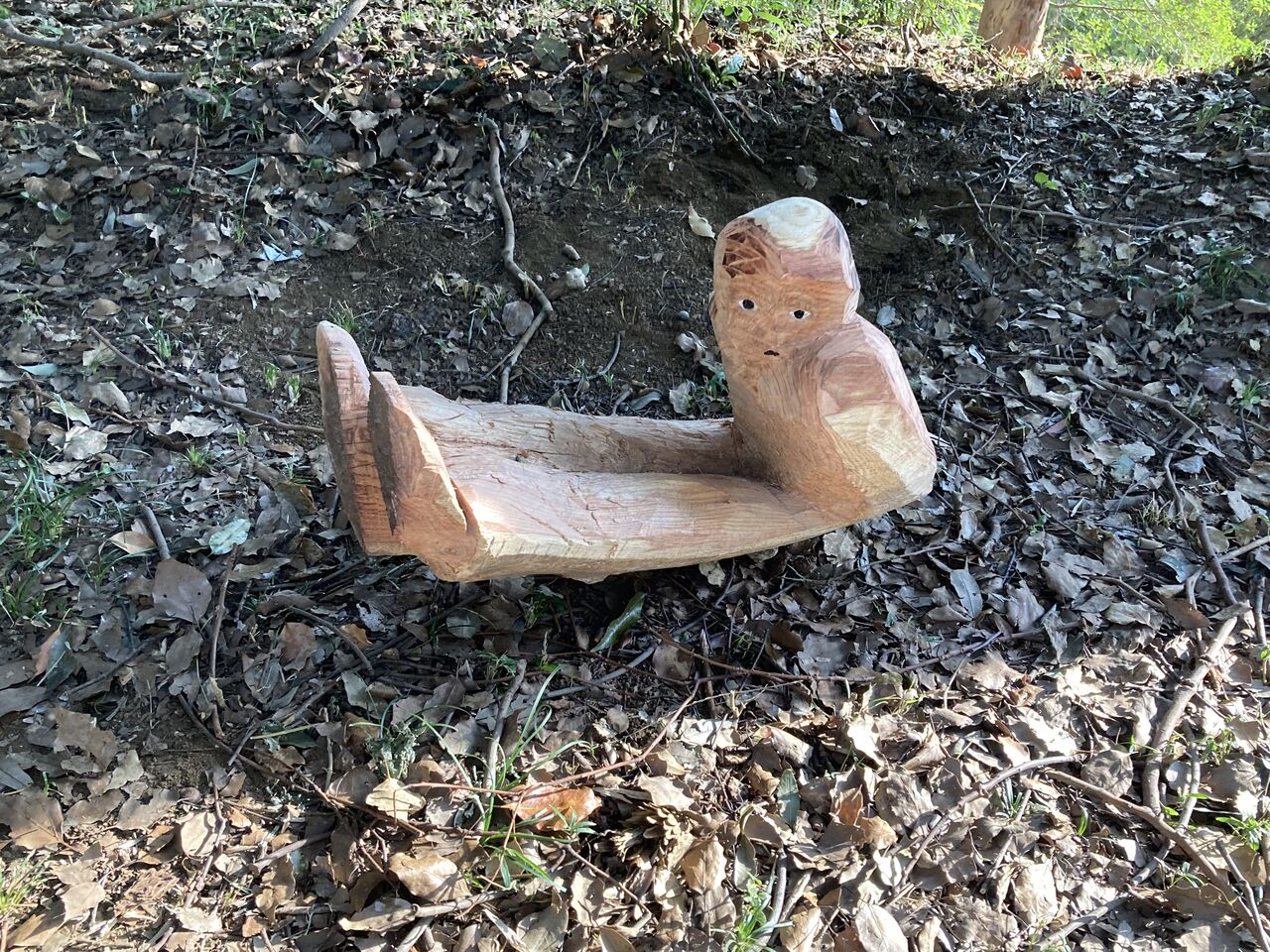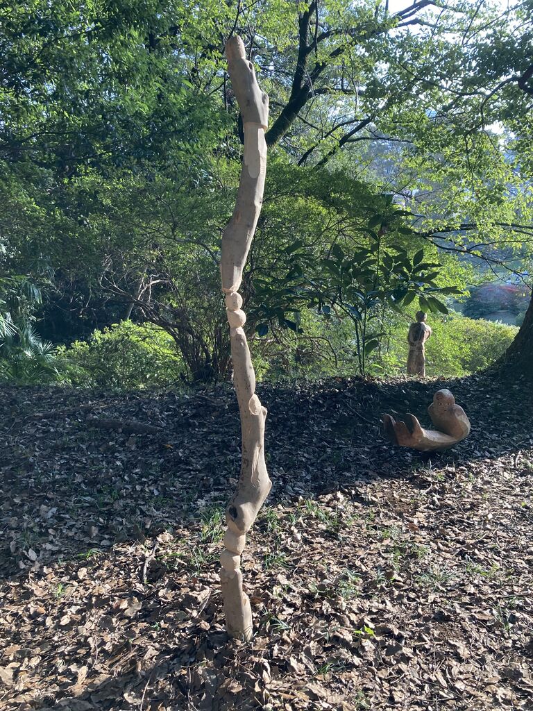 園内唯一のアート作品の展示スペース。作者の高橋瑠璃さんは、普段は石彫を専門とされているそうですが、今回は園内の伐採木を再利用して木彫り彫刻に初挑戦されたとのこと。