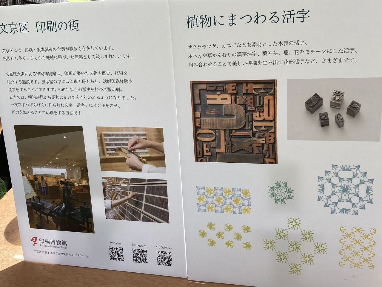 文京区の印刷博物館の展示スペース。可愛らしい植物形の活字の展示と、植物の学名を印刷してオリジナルしおりが作れるワークショップが行われていました。
