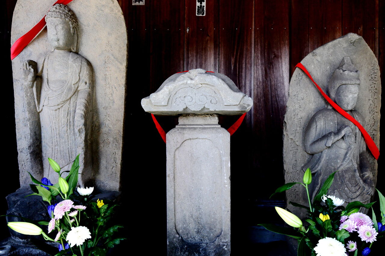 ph9 西向地蔵尊。処刑場跡に設けられた。左は阿弥陀。中央の石塔は文字が判読不能。右は正観音。本町2-23。2023.7.10