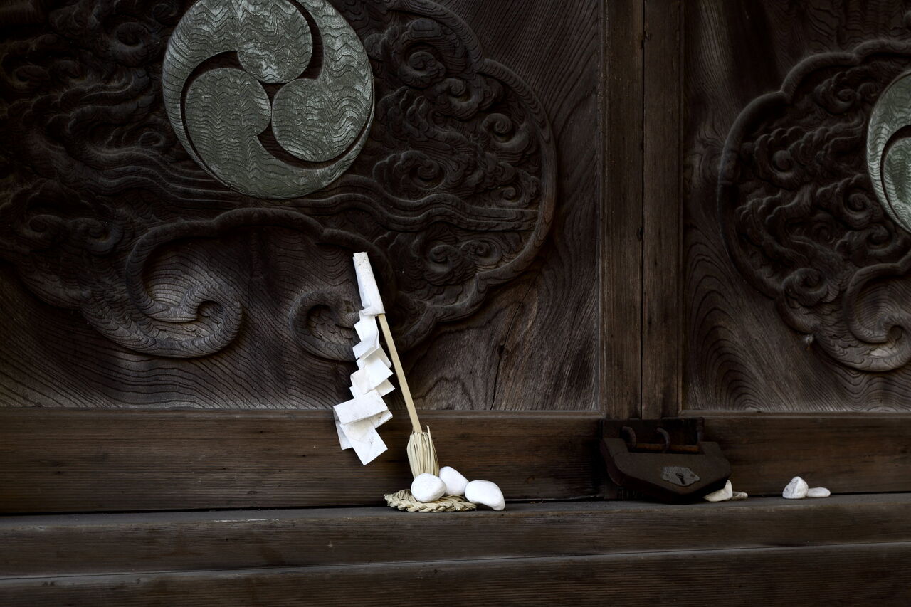 ph15 御殿通り。道祖神社。社殿に供えられた幣帛と小石。本町4-38。2023.7.10