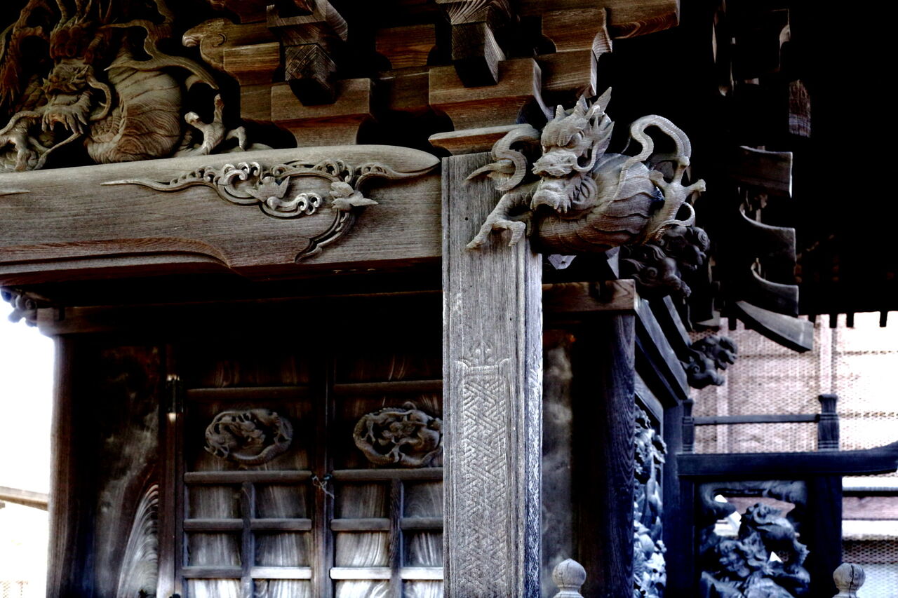 大師堂は鍵が掛かっていなかった。扉を開けてみると、手のひらに載るほどの大師像が厨子に納められ、すぐ後には稚児大師の図像が飾られていた(ph11。註5)。その昔、修験の御師や高野聖が笈に背負って、各地を行脚したという厨子もこんなものではなかったかと想像してみたが、はたしてどうだったのだろうか。この小さな大師像の由緒については、うっかり聞き洩らしてしまった。