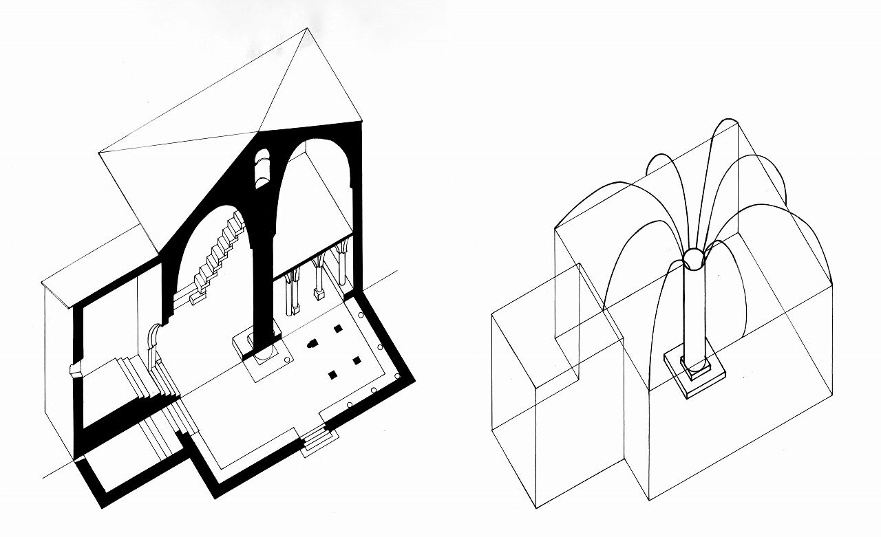 周りには集落どころか何もない場所にぽつりと建っている建設年代不詳のサン・バウデル・デ・ベルランガ(San Baudel de Berlanga, Soria近郊)の教会はモサラベ建築中、もっともオリジナリティーに富んだもの。そのプランは方形の8.5 X 7.5メートルの内陣に、4.1 X 3.6メートルの祭壇が付くというものだが、注目に値するのは中央に円柱が聳え立ち、ここからは8本のリヴが延び、これがちょうど傘をさしたように軽い凝灰岩のヴォールトを支えている。そのヴォールトと屋根との間には空間があり、ここは柱上修行の場であったのではないかとも解釈されうる。柱上修行とはまさしく柱の上に鎮座しここで自然以外は外界との接触を断ち修行するという苦行が流行った時代がキリスト教圏ではあった。そのうえ祭壇とは反対の側には5 X 2ベイの明らかにイスラーム空間を回想する円柱の列柱がある。その上はトリビューンとなっている。これは修道僧の住空間と考えられていて、この出入りのためにここに直接外から出入りすることができるように小さな開口部がついている。イスラーム教徒とキリスト教教徒が空間を共有していたのであろうか。これも摩訶不思議な組み合わせだ。この時代はこれを許していたのだろうか。