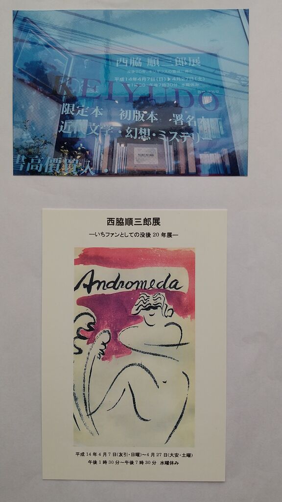 2002年(平成14年)4月7日から4月27日の期間、西脇順三郎の絵画と著作(主に詩集) を蒐集したものを「いちファンとしての没後20年展」として展示しました。開催場所は、当時、港区高輪にあった限定本や初版本を主として扱っていた書肆・啓祐堂 (今は廃業されています) という狭いギャラリーを併設した古書店でした。