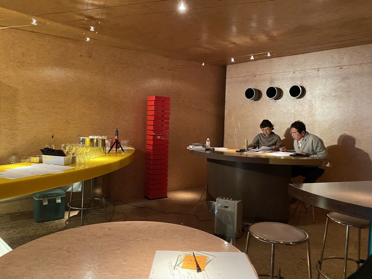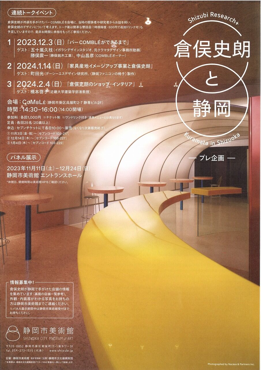今回のトークショーは、「COMBLE」(1988年)の現場監督をされ、1986年から5年半クラマタデザイン事務所に勤務された五十嵐久枝さんと、建築や内装の工事を手掛けクラマタデザイン事務所の仕事を多く任された勝俣震一さん、当時COMBLEのバーテンダーを任され現在オーナーをしている中山昌彦さん、そして司会進行は静岡市美術館・学芸員主査の伊藤鮎さんでした。