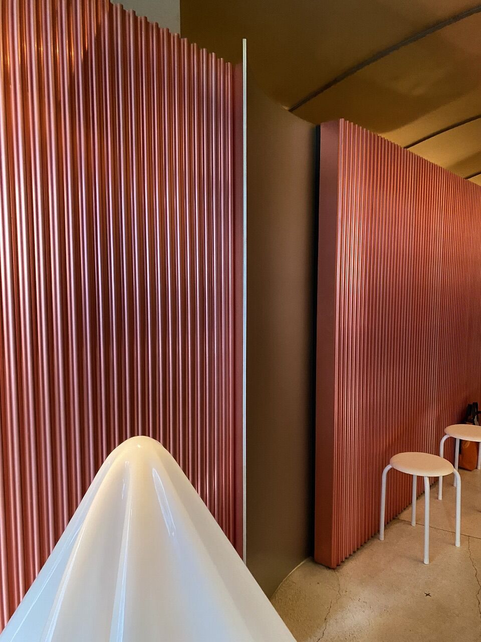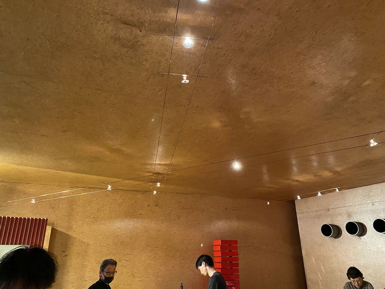 コンブレもOSBを使用し、パールピンクに塗装され、よく見ると薄っすらキラキラした桜色になっていました。なぜOSBを使いたいと思ったかは不明だそうですが、ある日突然、倉俣先生が事務所に90cm角のOSBを2枚持ってきて、これを店舗に使いたいと言ったそうです。テラゾーやスターピースなどは床や壁に使用できても、天井に使うとガラスが落ちて来る可能性があるため天井には使えなかったそうですが、OSBなら床、壁だけでなく、天井も使用できると。そして、「扉はOSBでS字にしたい。シンちゃんできる?」という倉俣先生の要望に応えるべく、アルミをS字に曲げて、2mmのOSBを貼って実現したそうです。