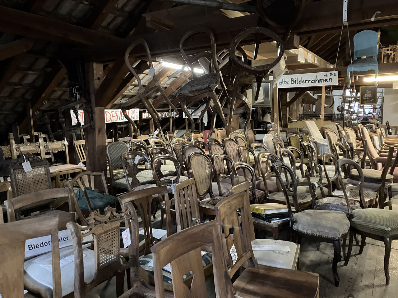 そこは、同じブロッケンハウスでも、アンティーク家具を専門に修復して販売しているお店です。上記の意味で通常のブロッケンハウスとは目的が違いますが、古い建物に入ると椅子がズラーっと並んでいました。