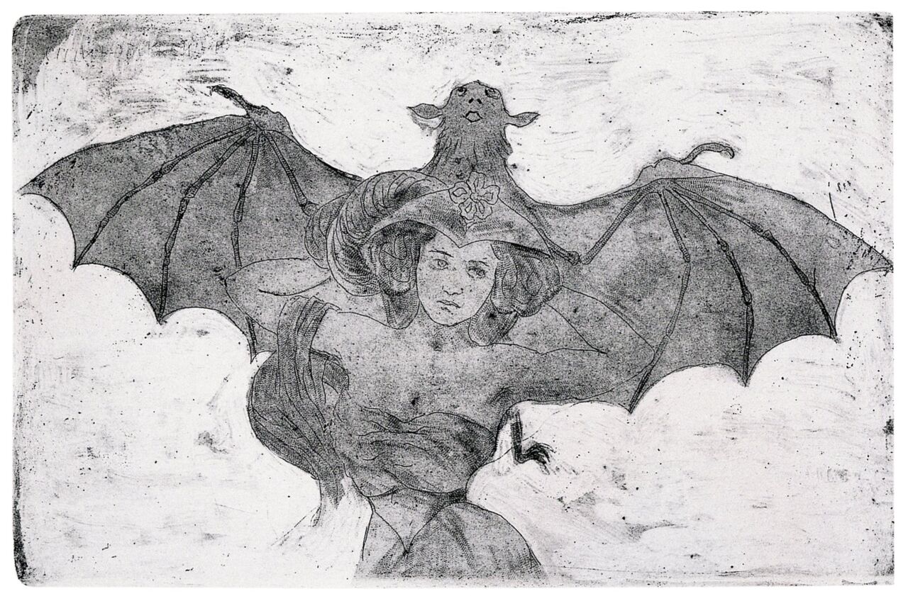 図4:ルッソロ《コウモリ女Donna pipistrello》、1907年(エッチングとアクアチント、16.8×25.0cm、個人蔵)