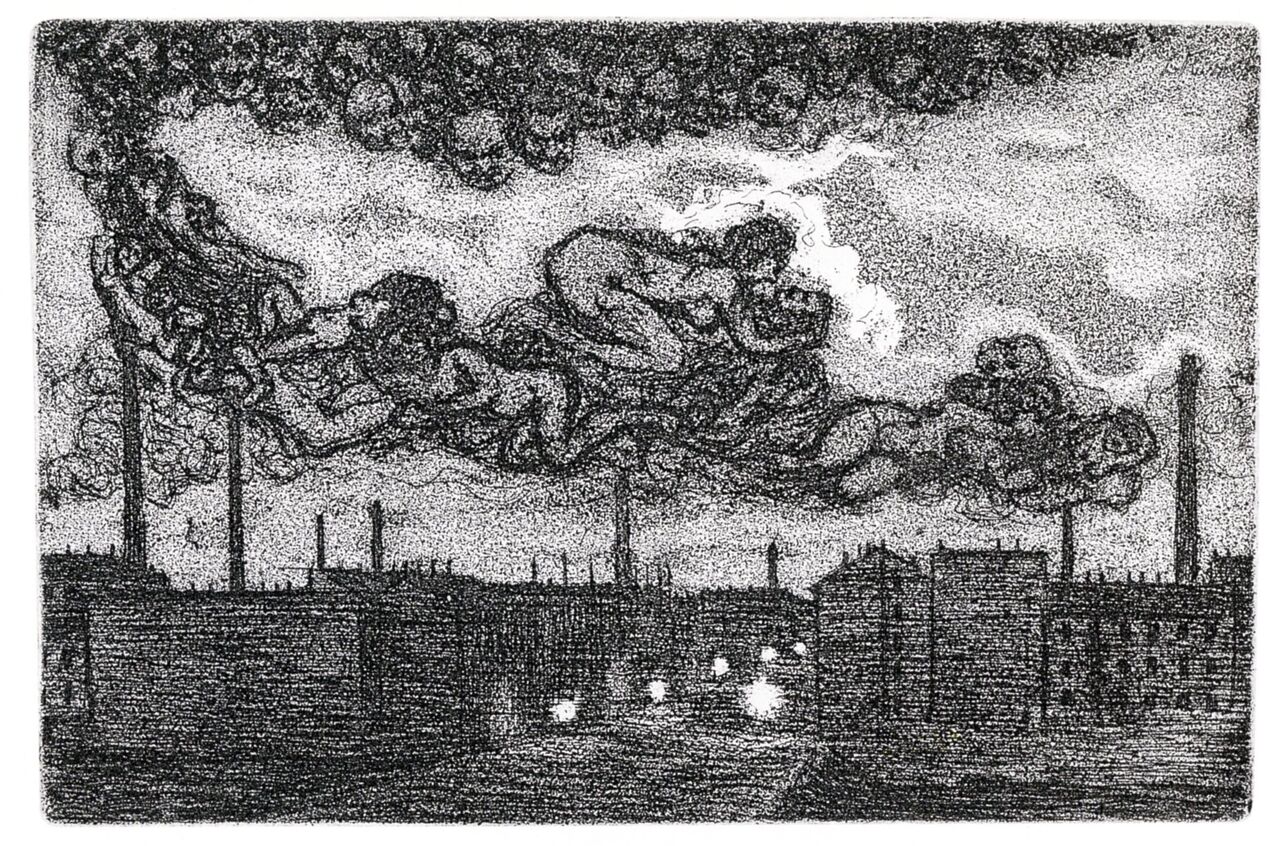 音楽を学ぶ兄たちのため、家族でミラノに転居した後のルイージ少年は、レオナルド・ダ=ヴィンチの《最後の晩餐》の修復作業の徒弟などを経て、版画の技術を学んだ。おおむね1905-1910年ごろにかけて、彼は数十点のエッチングおよびアクアチントによる版画を制作している。そこに現れる優美な女性/擬人像、骸骨/死やモンスターのイメージからは、ガエターノ・プレヴィアーティ(1852-1920)らによるイタリアの、さらにドイツや北欧の象徴主義が、いかに若き芸術家たちに(ボッチョーニら同世代の仲間を含めて)影響を与えたかを推測させる。幻想的な《コウモリ女》【図4】は、1907年に原版が制作されていたものの、20世紀において実際に紙面に印刷・流布された形跡がなく、2006年に印刷されたことで初めて目にすることができるようになった作品である。こうした象徴主義的な時期の終わりは、「都市」という未来派的テーマが版画にも登場し出したという事実で確認されるが、その最後の局面において現れた《眠れる都市》【図5】は、夜のミラノ郊外の工場の中にいくつかの電灯が光っている一方、上空には煙突の先から出る煙のように裸体の人間の霊体が浮かんでいるという、二つの世界の対立/混交を示しているような風景となっている。