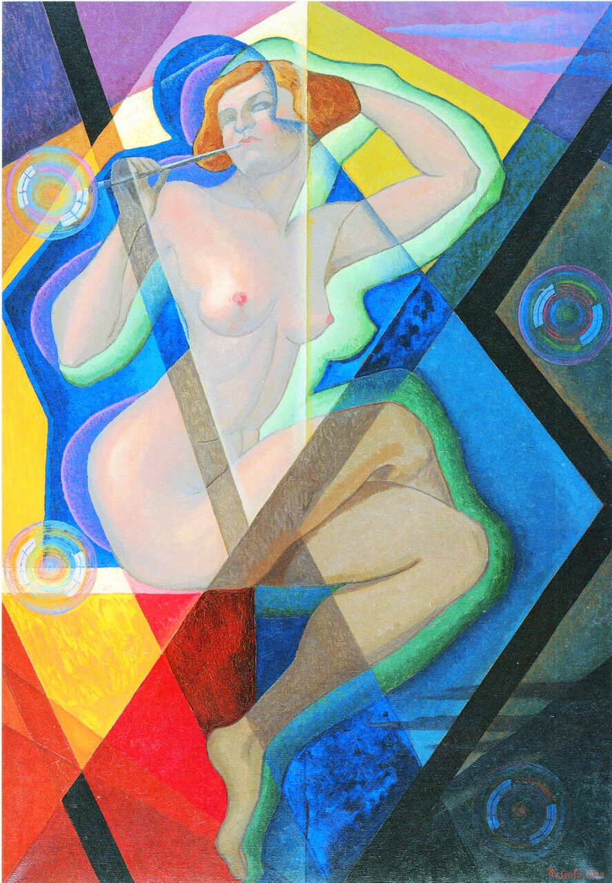 一方、こうした音楽方面での評価の反面、視覚芸術の方面におけるルッソロの作品はそこまで知られてきたとは言えない。前述のウォーターハウスの音楽史的かつ古典的な記述は、彼の画家としての活動を「騒音の芸術」以前の1911-13年に集中したものとし、再び画業に戻るのは長い音楽家の時期を経た1941年以降のこととしていたが、実際のところルッソロは「音楽家期」にも断続的に画業を続けている。確かに、イタリア未来派の作品として日本で最も早く図像が紹介されたうちの一つでもある《叛乱》【図2】のような、いかにも「未来派らしい」作品は1910年代に集中しているものの、1920年代には最初に挙げた《自画像》の他、《シャボン玉》【図3】のようにフランスの美術館に収蔵されている作品も存在している。1930年初頭には、未来派の後続世代として活躍しつつフランスの造形動向も独自に吸収していた、プランポリーニ(1894-1956)やフィッリア(1904-1936)らとともに、パリの「抽象―創造」グループの母体の一つとなっていく「円と正方形」への参加を、イタリアの側から表明したこともある。