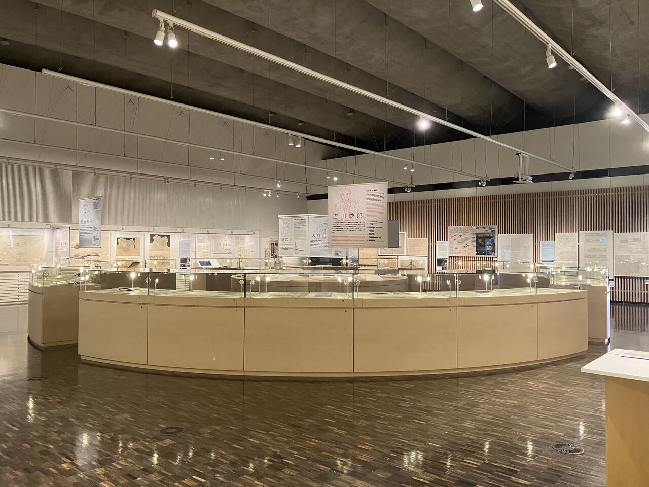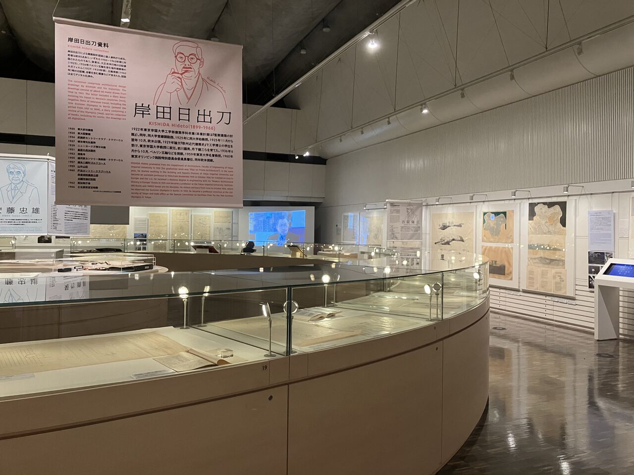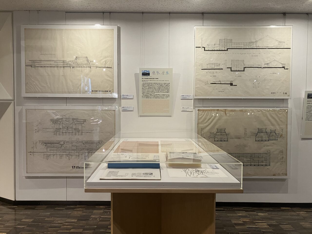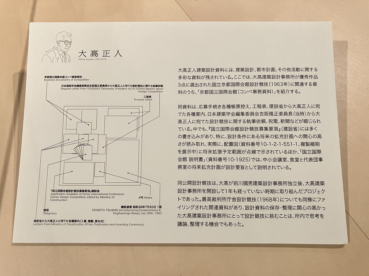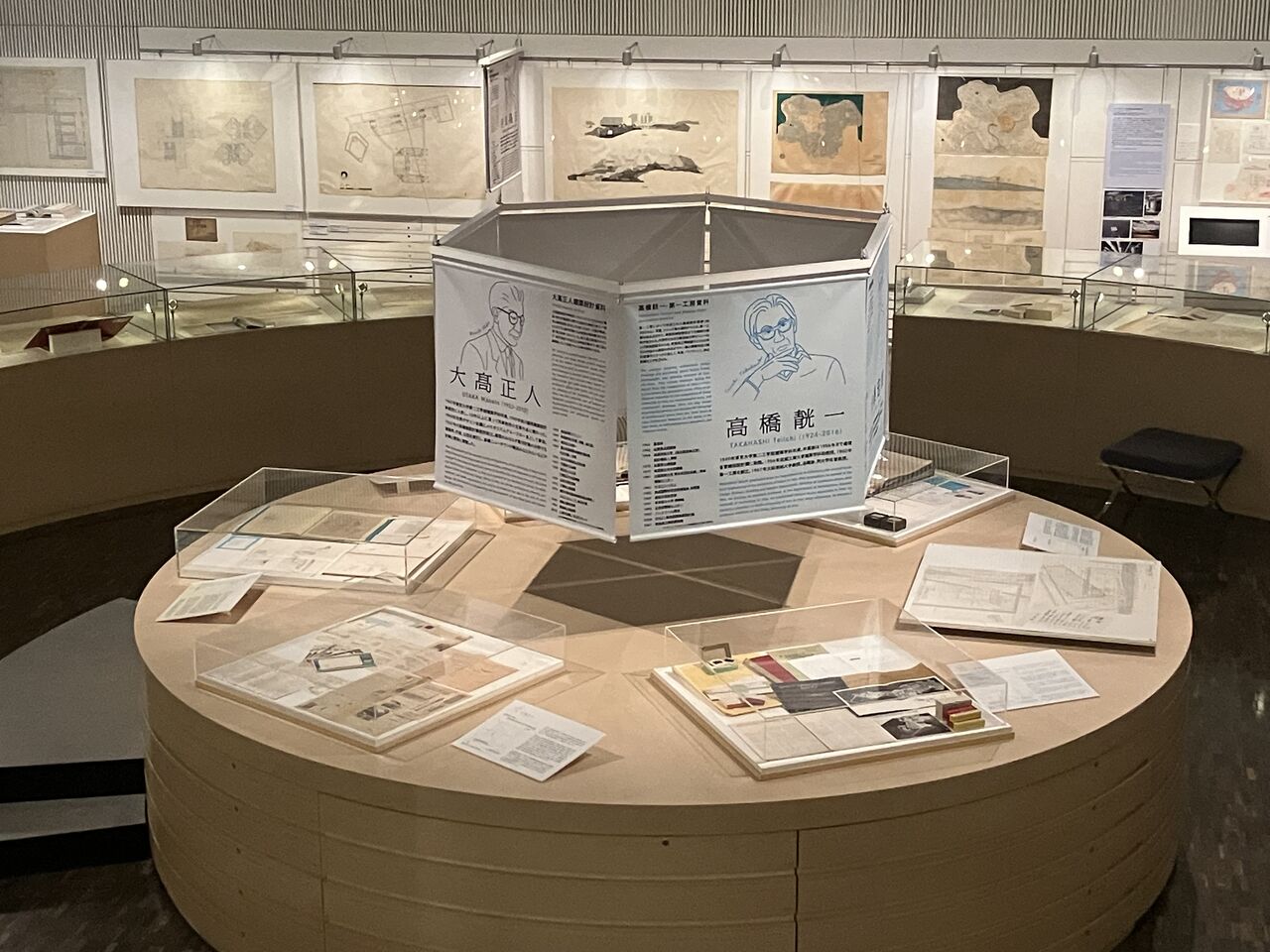 館内の壁面では、「国立京都国際会館」の応募案として、高橋靗一案、菊竹清訓案、大髙正人案、大谷幸夫案の4案それぞれ断面図、川添登による記録と菊竹清訓によるスケッチを展示している。手にとって見ていただける参考資料として、各案の基本図面の複製(縮小して複写したもの)のほか、中央の円形展示台上にある大髙正人建築設計資料群の展示ケース内には、大髙正人建築設計事務所でファイリングされていた同コンペの関連資料を用意した。