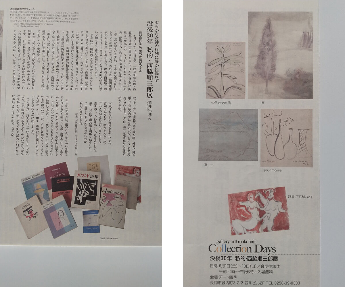 2012年 (平成24年) 6月1日から6月10日、今回は地元・長岡市で西脇順三郎展を開催しました。私が長岡に帰郷してから4年が過ぎていましたが、やはり10年という記念年になりますと改めて自分の中の何かが動き出してくるもので、地元の皆さん、特に年代の若い方々にはぜひ西脇順三郎という名前だけでも知ってもらいたいとの思いがあったからでもあります。この頃親しくさせていただいていた市内の文化情報紙『マイ・スキップ』(現在は休刊中) に展覧会の広告を兼ねて記事を書かせていただきました。