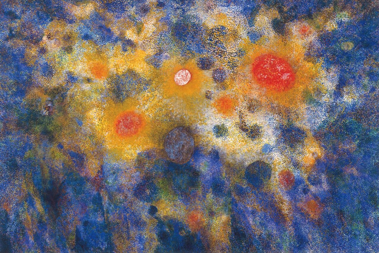 描かないで絵を作るという間接性を取り込むことによって、画面の中から光が出てくるような絵画に到達したのだと考えられます。色彩の選択など、試行錯誤を繰り返すことで、光というすごく大事な要素をとらえたのだと思います。