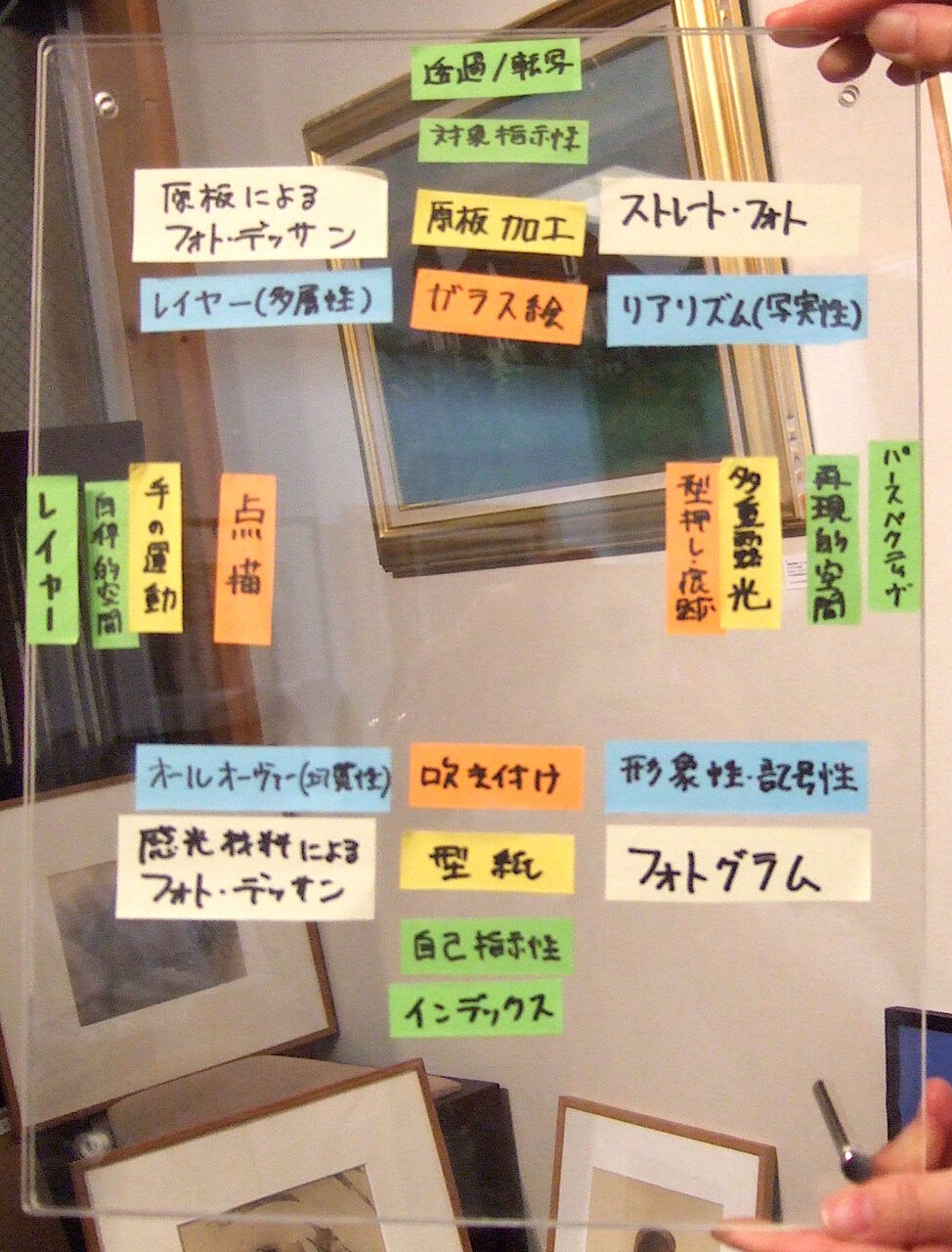 次に、右上と左上を接続する位置には、ガラスに対して描画を施す「ガラス絵」と、カメラで撮影された像が定着されたガラスの乾板に介入する「原板加工」がきます。左上では、「原板によるフォト・デッサン」と「レイヤー(多層性)」が、同じグループに入っています。