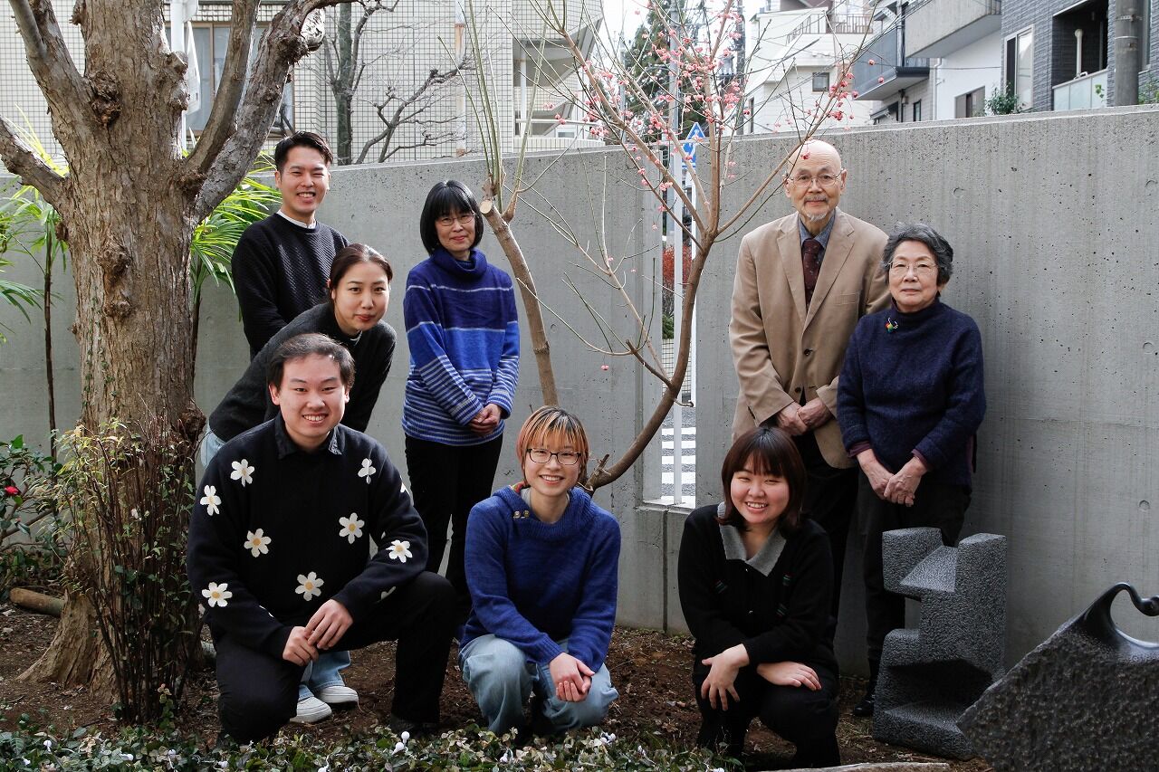 オノサトと瑛九は生涯の盟友でしたが、スタッフの集合写真(この日、津田は学業のため欠席)の真ん中で小さな花をほころばせている檀の木は浦和の瑛九と都夫人の旧宅の庭から移植いたしました。根付いてくれるといいのですが。
