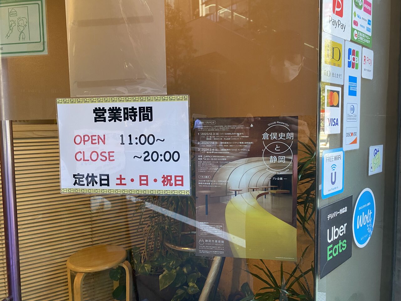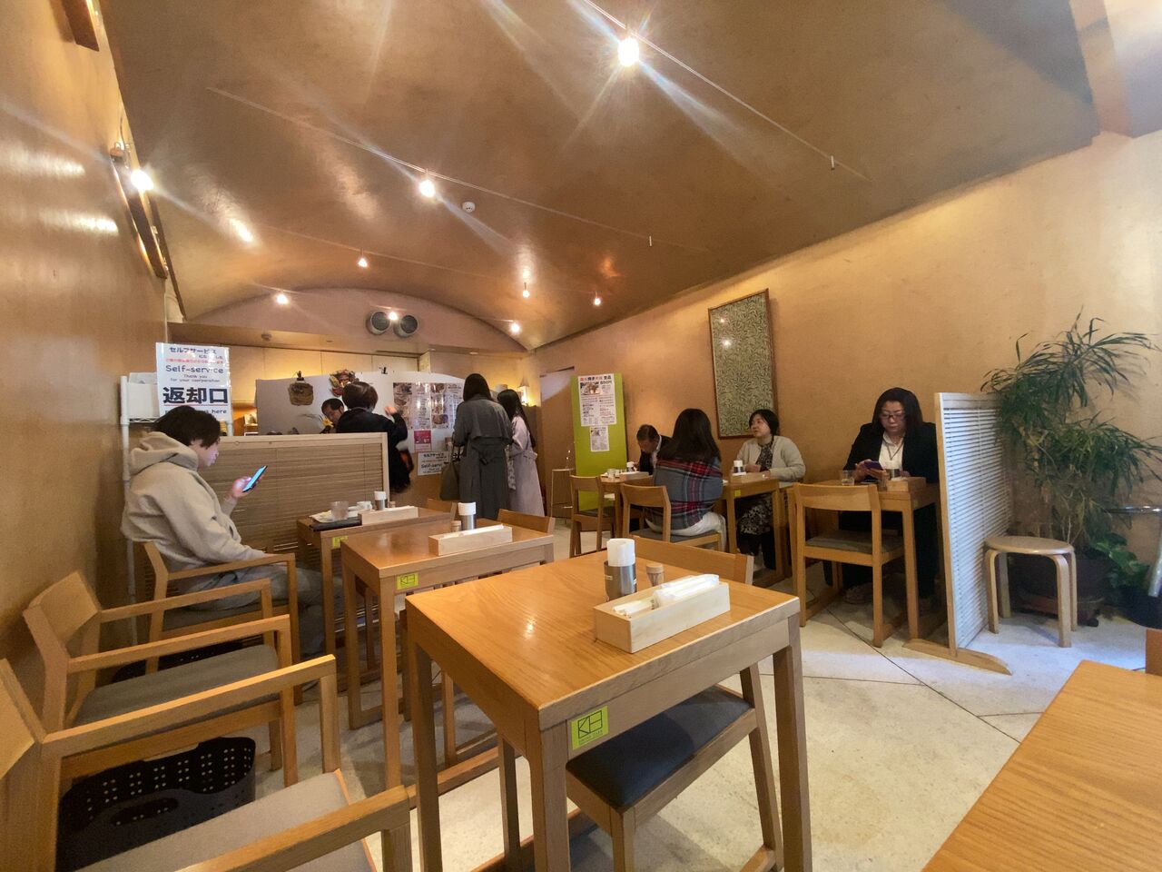 店内はランチで混んでます。現在でも内装はコンブレのようにOSBの壁。倉俣先生の傘立てや椅子が置いてあり、床もテラゾー。