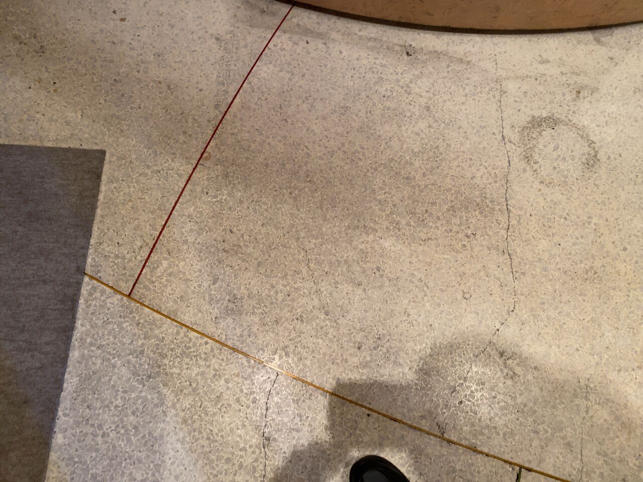 床のテラゾー。綺麗な赤と黄色の線が入っている。
