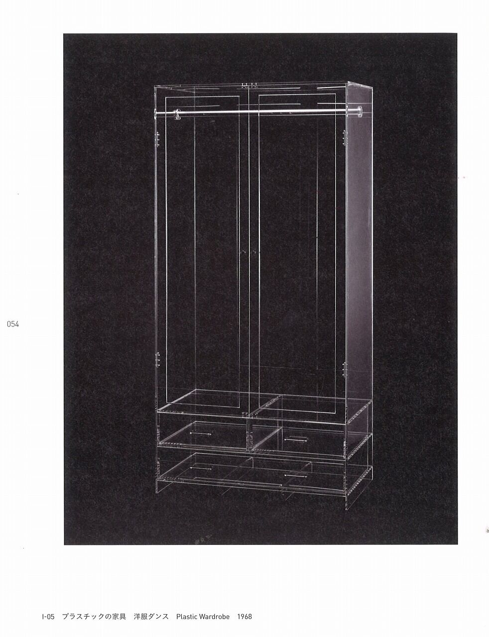 まるで箪笥のレントゲン写真のような《プラスチックの家具 洋服だんす》。家の中でも存在感がある洋服だんすが、透明になることで存在感が消える。それなのに私に強烈な印象を与えます。《ガラスの椅子》と同じで、ありふれた形をしているからこそ素材が引き立つ。倉俣先生のアクリル作品は、透明というアクリルの効果によって、中身だけが浮かんで見える面白さがあります。