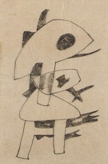 そのような特徴をふまえると、この《少女》という作品は、ひとつの技法によって制作されており、制作に用いられた型紙(fig.2)も現存しており、制作の工程を明確にすることができる珍しい作例といえる。具体的に示すならば、透明なセロファンにペンで描画された型紙(fig.2) を、印画紙の上に密着するように配置し、光をあてることによって、印画紙の上に、セロファンとは明暗が反転した画像が出現する。瑛九がよく用いる手法であるが、通常は、そこに型紙や様々な材料を組み合わせ、複雑な効果を湛えた画面が出現することが多い。だが、この作品は、セロファンに施された黒の描線が、焼き付けによって白い線として印画紙の上に出現する、極めて明快な制作工程を示している。