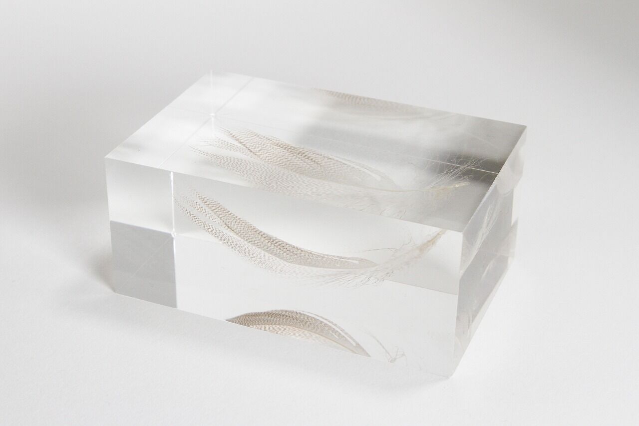 羽根の小品は、AXISの地下にあったお店の《アクリル・スツール》の試作品で、"Floating Feather"(白)とは別物で、サイズも一回り小さいです。