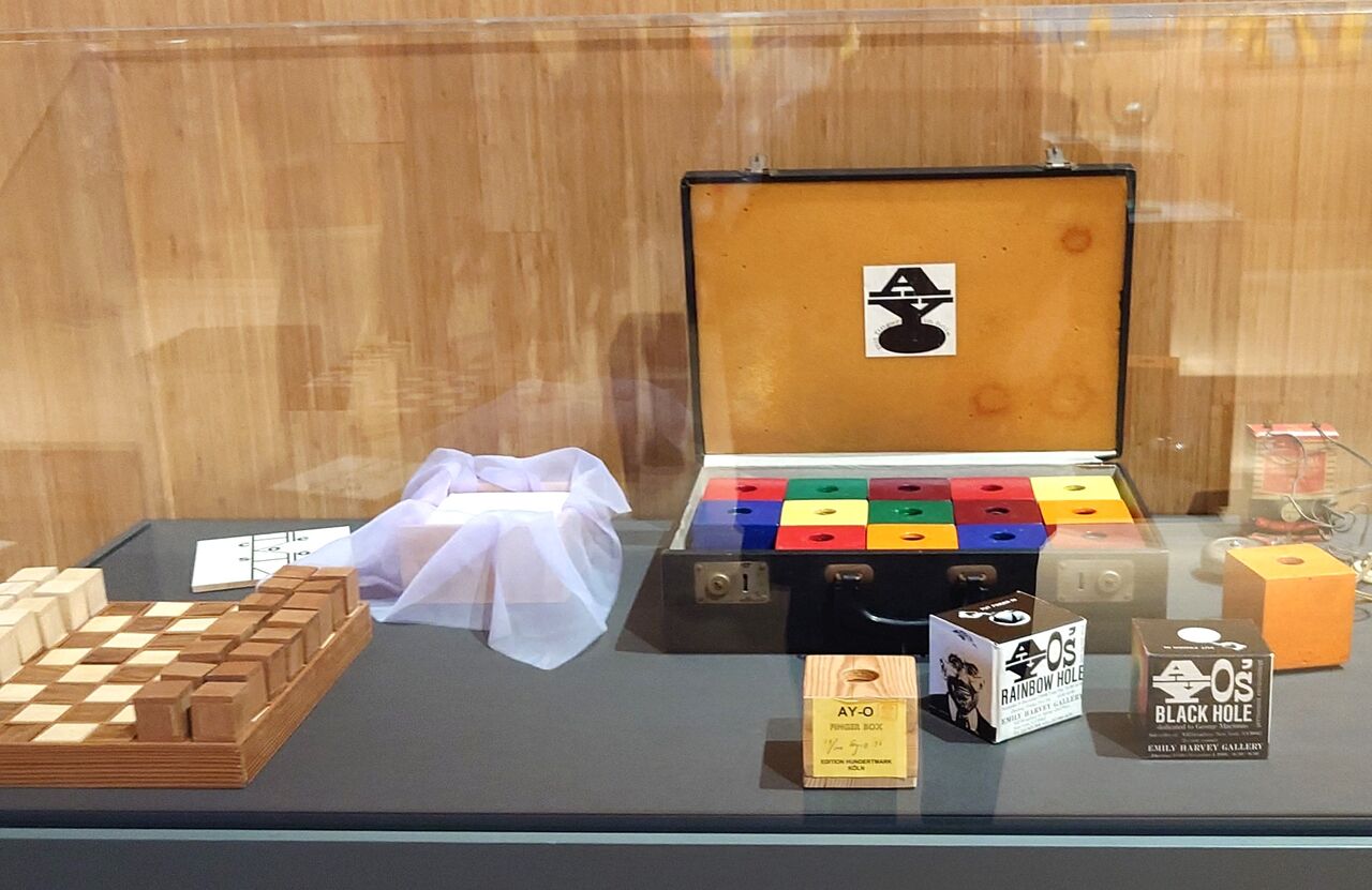 ちなみに、靉嘔が1958年にアメリカに渡ってからの仕事では、ニューヨーク「フルクサス」時代の、触覚表現の作品「Finger Box(フィンガーボックス)」が知られており、さらに1960年代からは、Environment(環境)を射程に入れた作品もいち早く発表したアーティストだった。