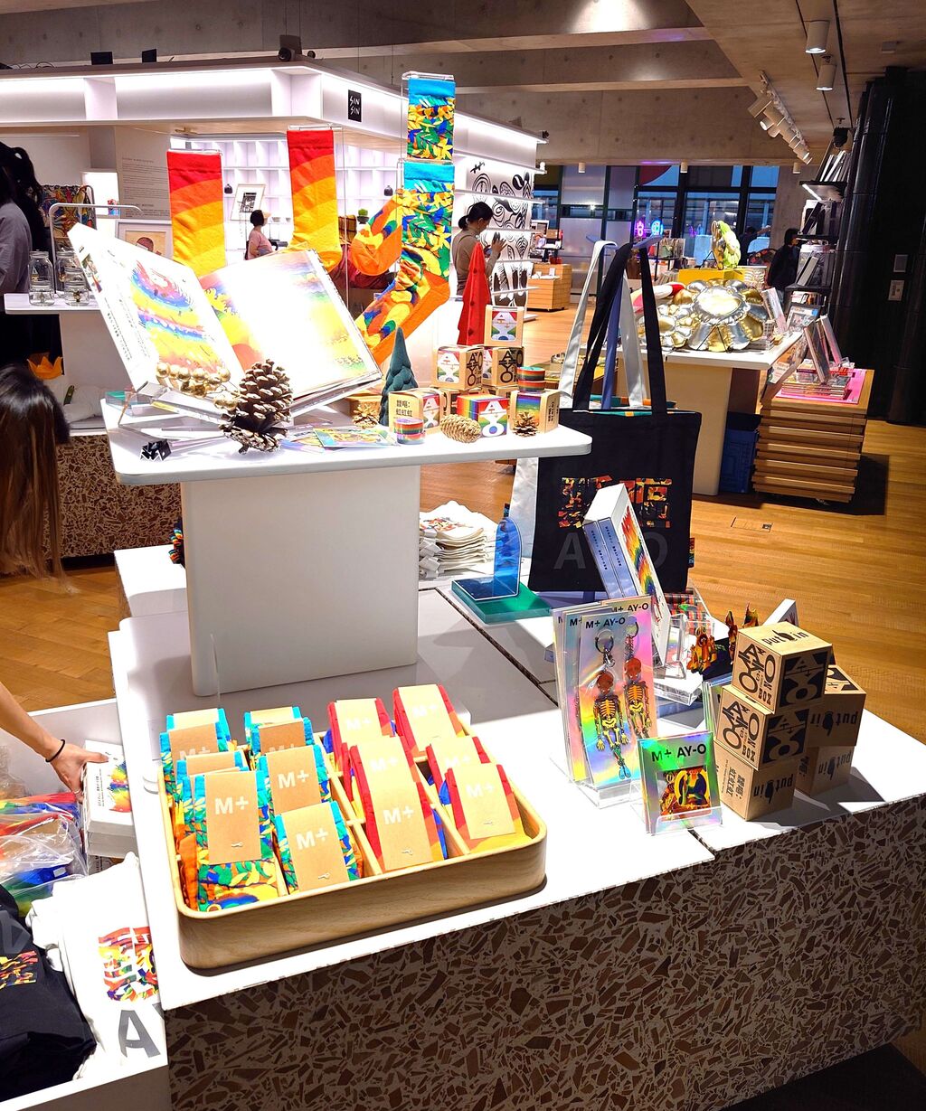 また、M+の1階にあるミュージアムショップ(The M+ Shop)には、靉嘔コーナーも設けられており、書籍、バック、ポストカード、靴下など、虹色のオリジナル商品が並んでいた。