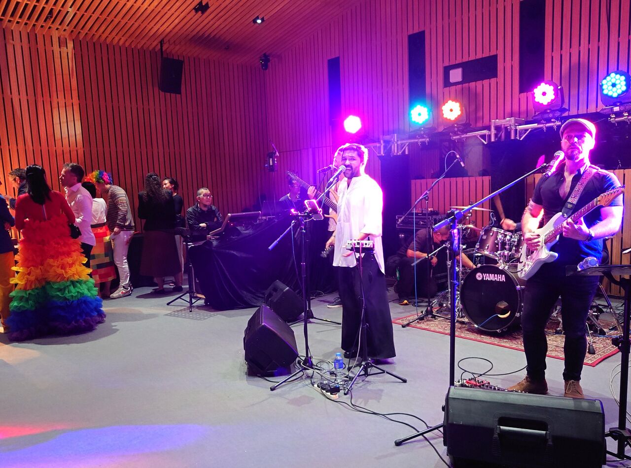 従来のテーブルでの会食ではなく、エレキギターによる生バンド演奏を聴きながら踊り出す人もいたほか、夜景が美しい美術館のベランダに出て自由に歓談する人たちもいた。