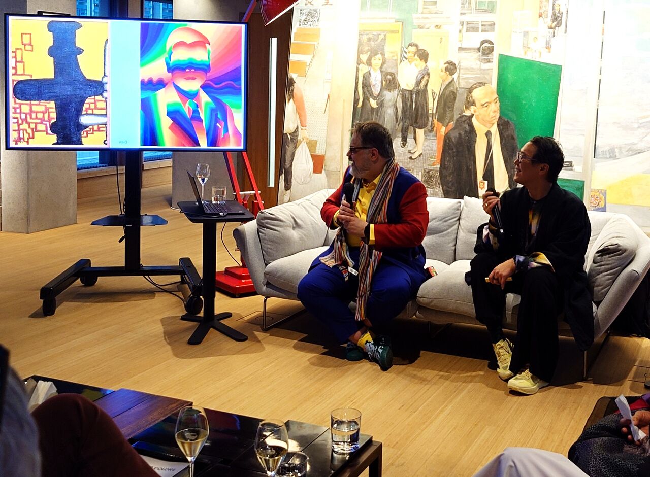 トークでは、靉嘔の初期の油彩作品《ひまわりとジェット機》(1955年)から、靉嘔と久保貞次郎との交流、そして、浮世絵の春画を使ったシルクスクリーン作品《レインボー北斎》(1970年)がアメリカで誕生した経緯などにも触れられ、靉嘔の詳細な仕事を知らないと語れないものだった。