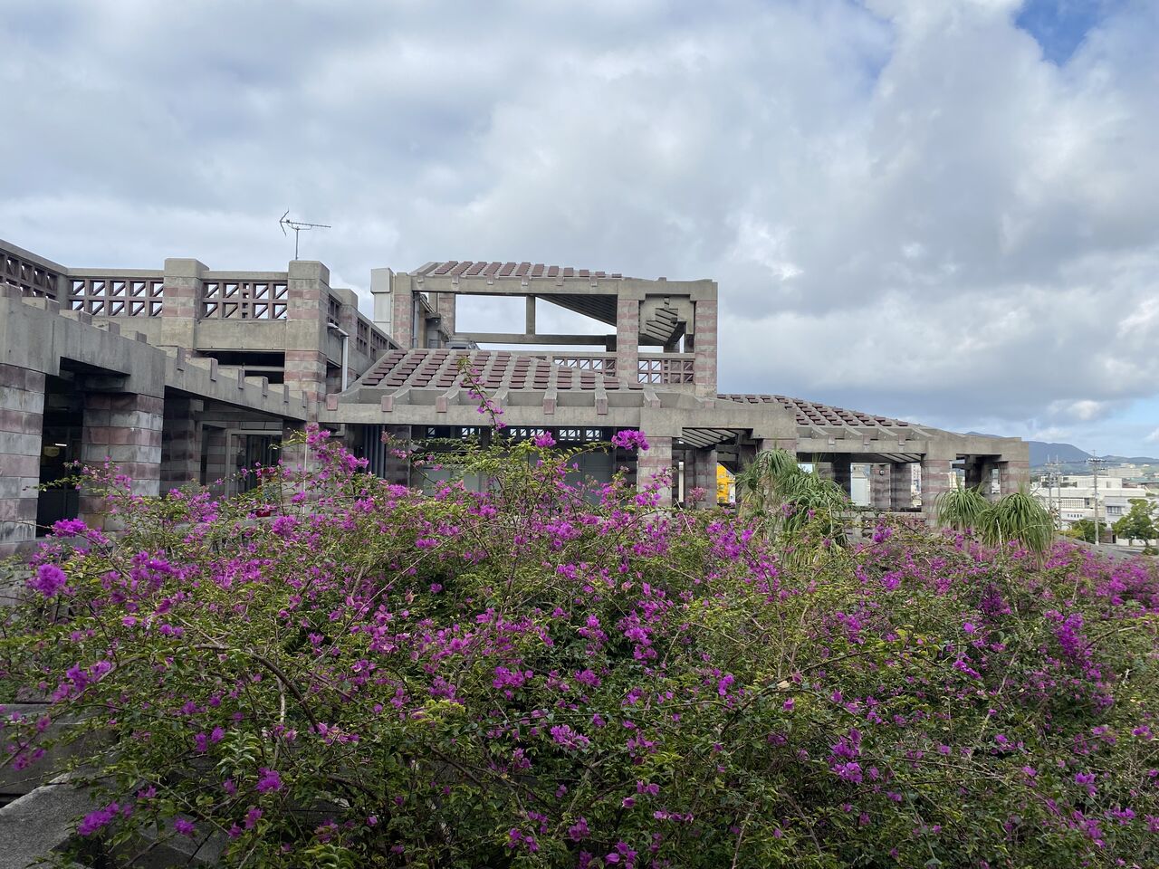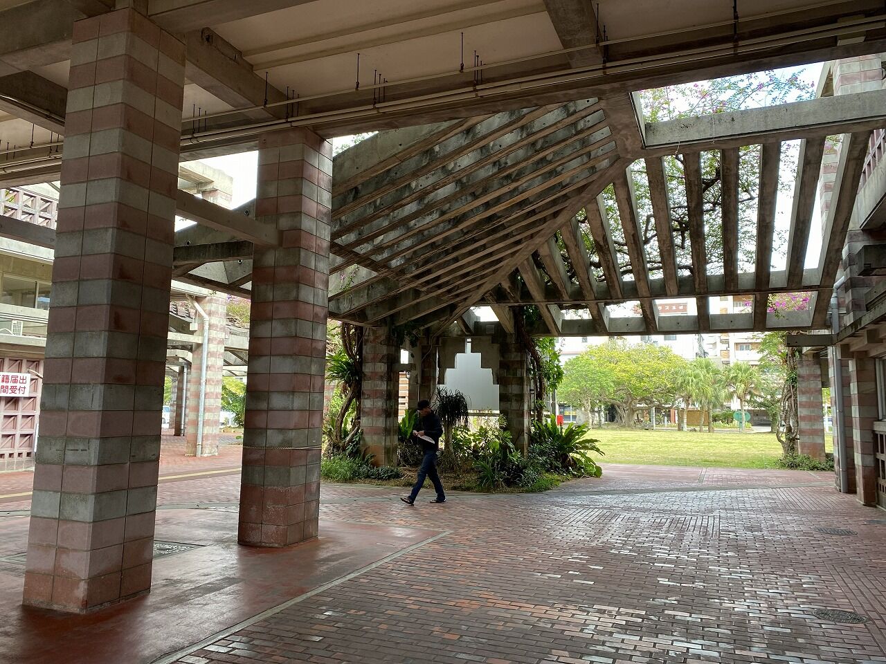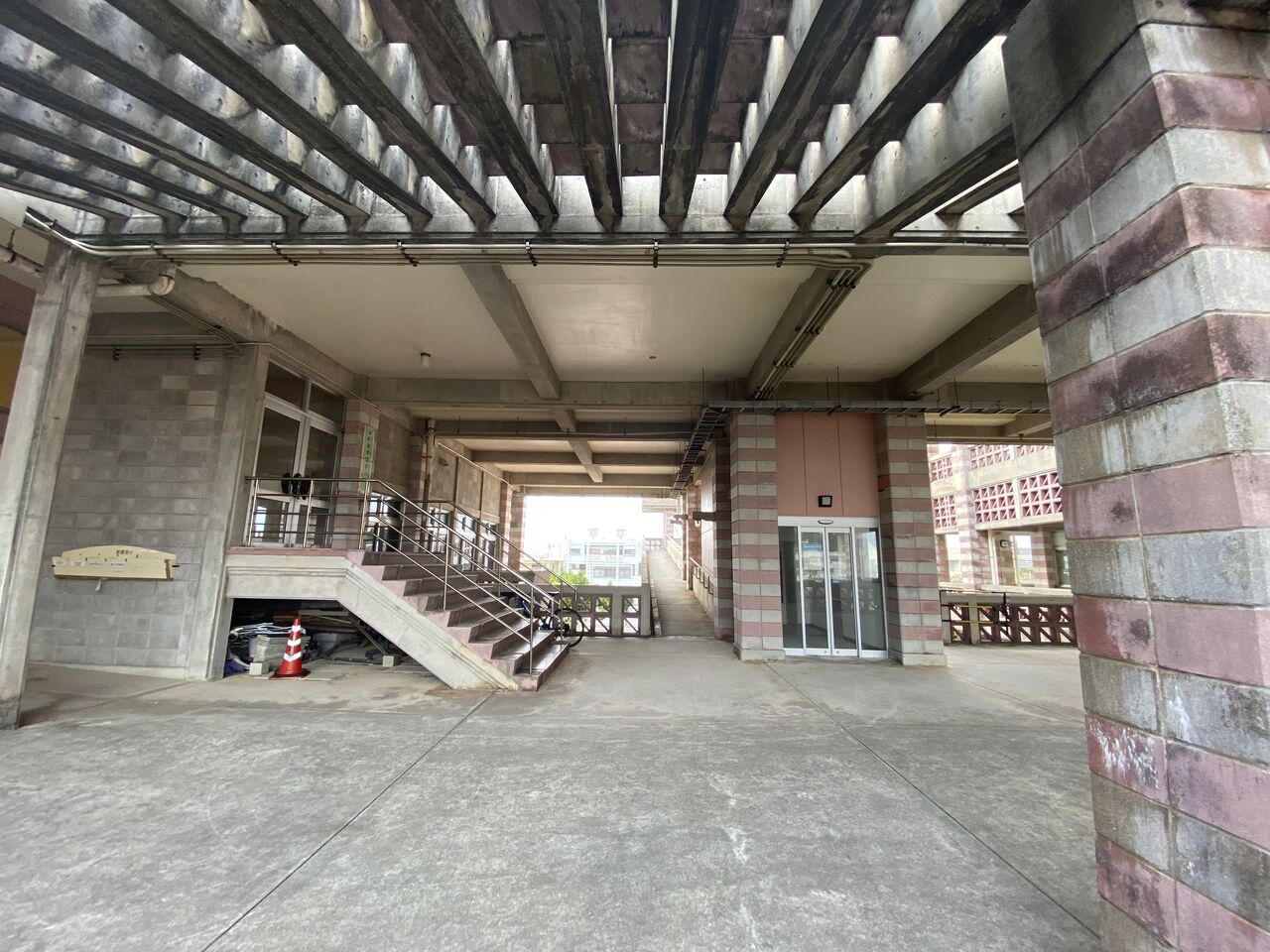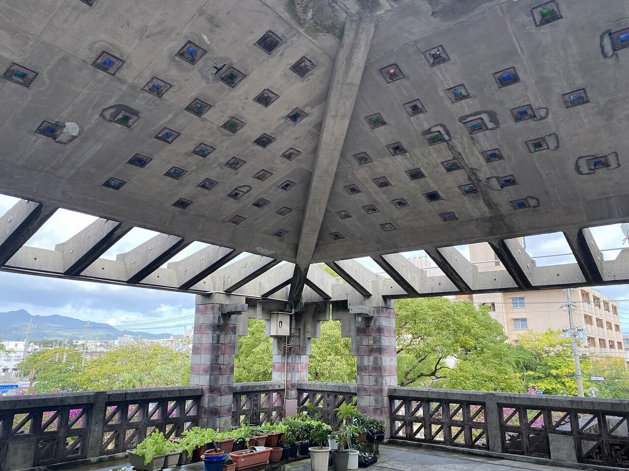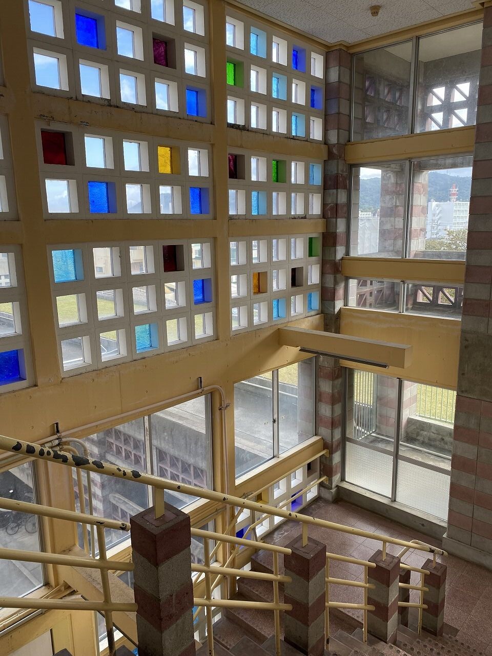 バルコニーとピロティの面積が広く、建物のほとんどが屋外。風が通り抜けるために通気性のある沖縄特有の花ブロックが使用されたり、テラスの屋根はレンガが完全にふさがれておらず通気性がある。この建築も沖縄の風土にあわせてつくられています。所々に正方形のカラーガラスを施しており、かわいらしさもある。