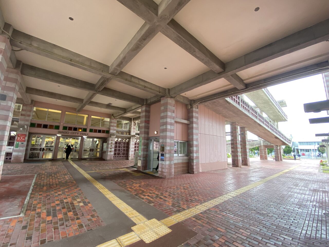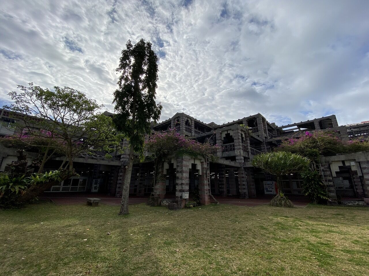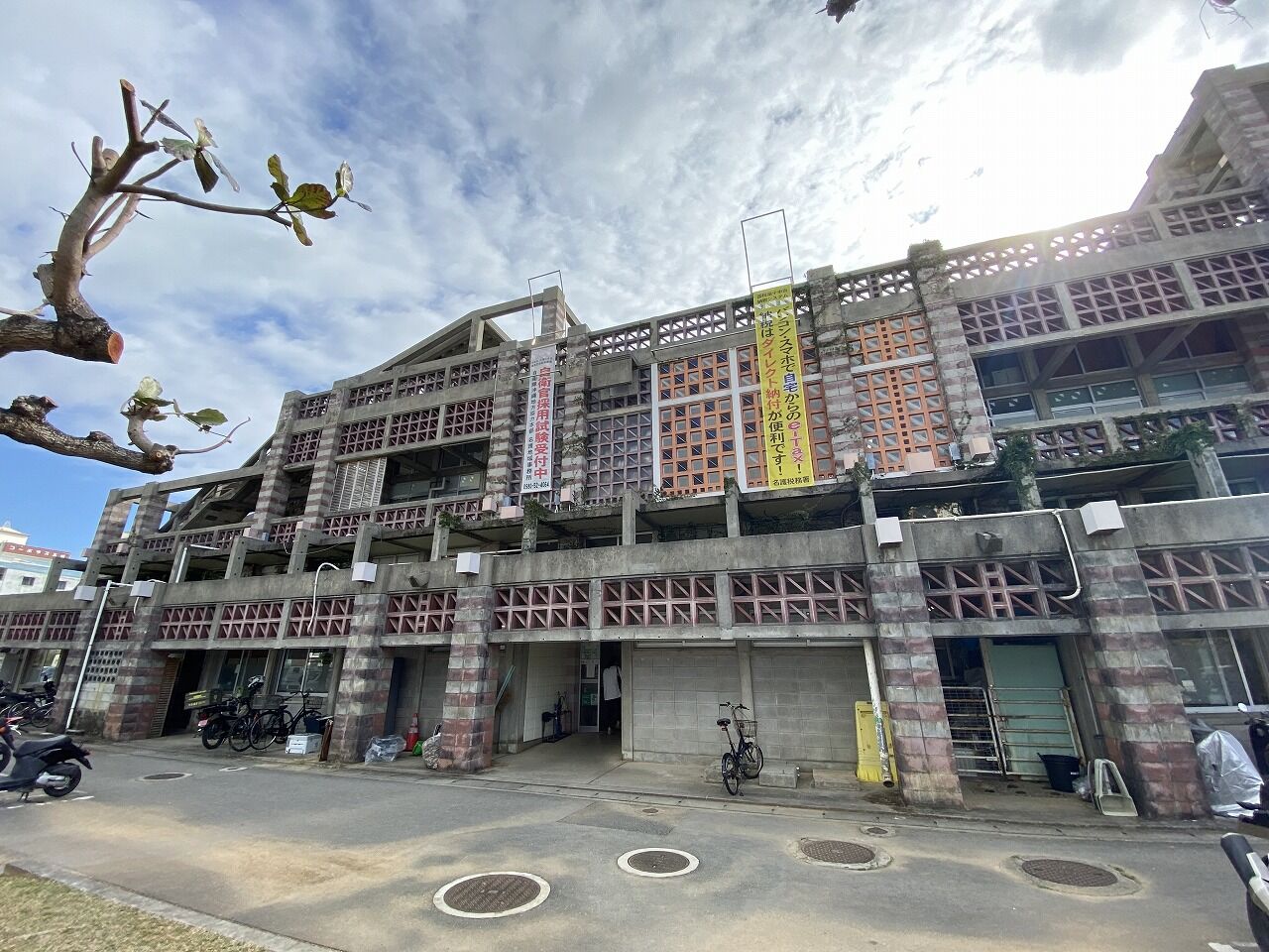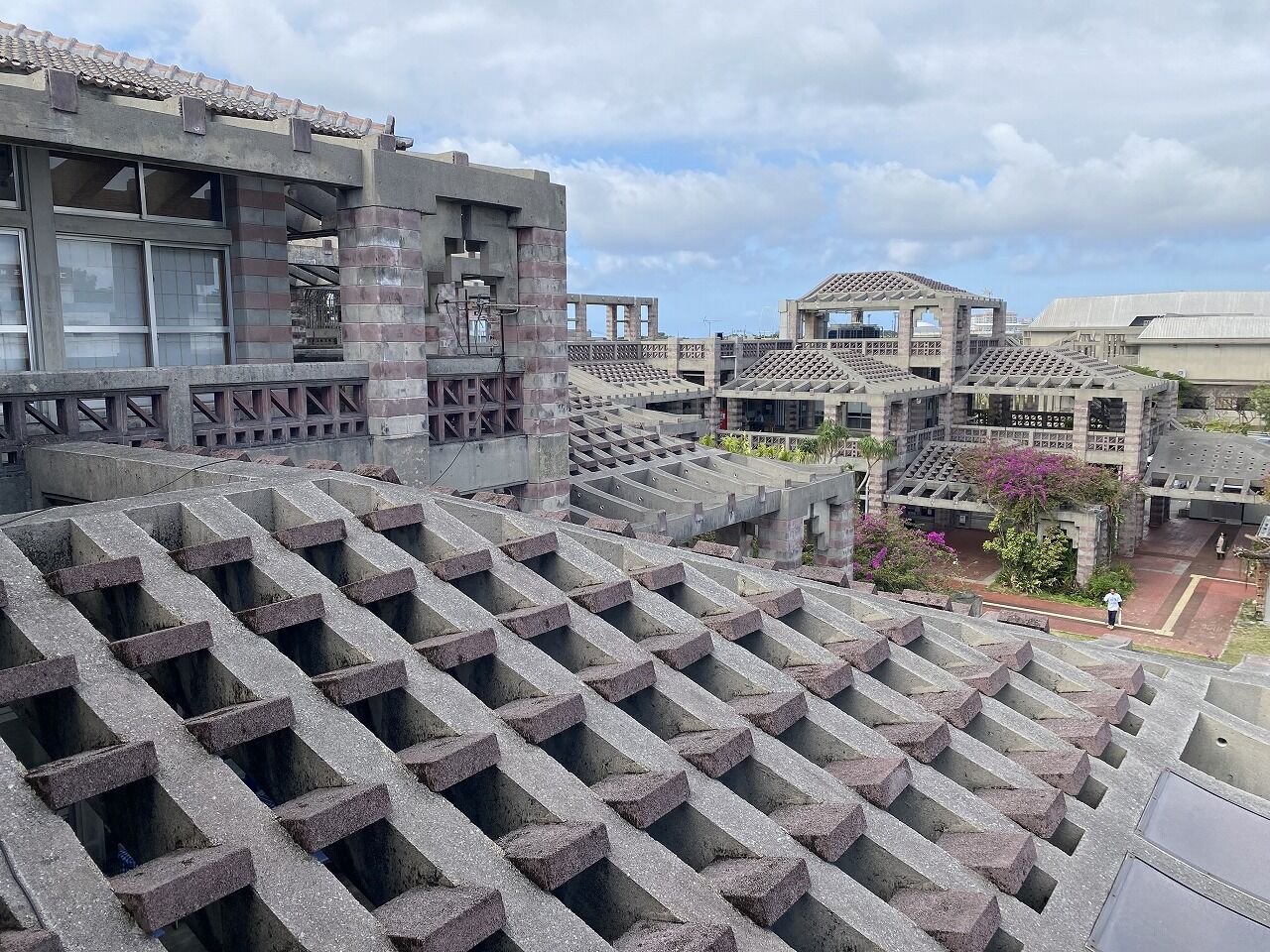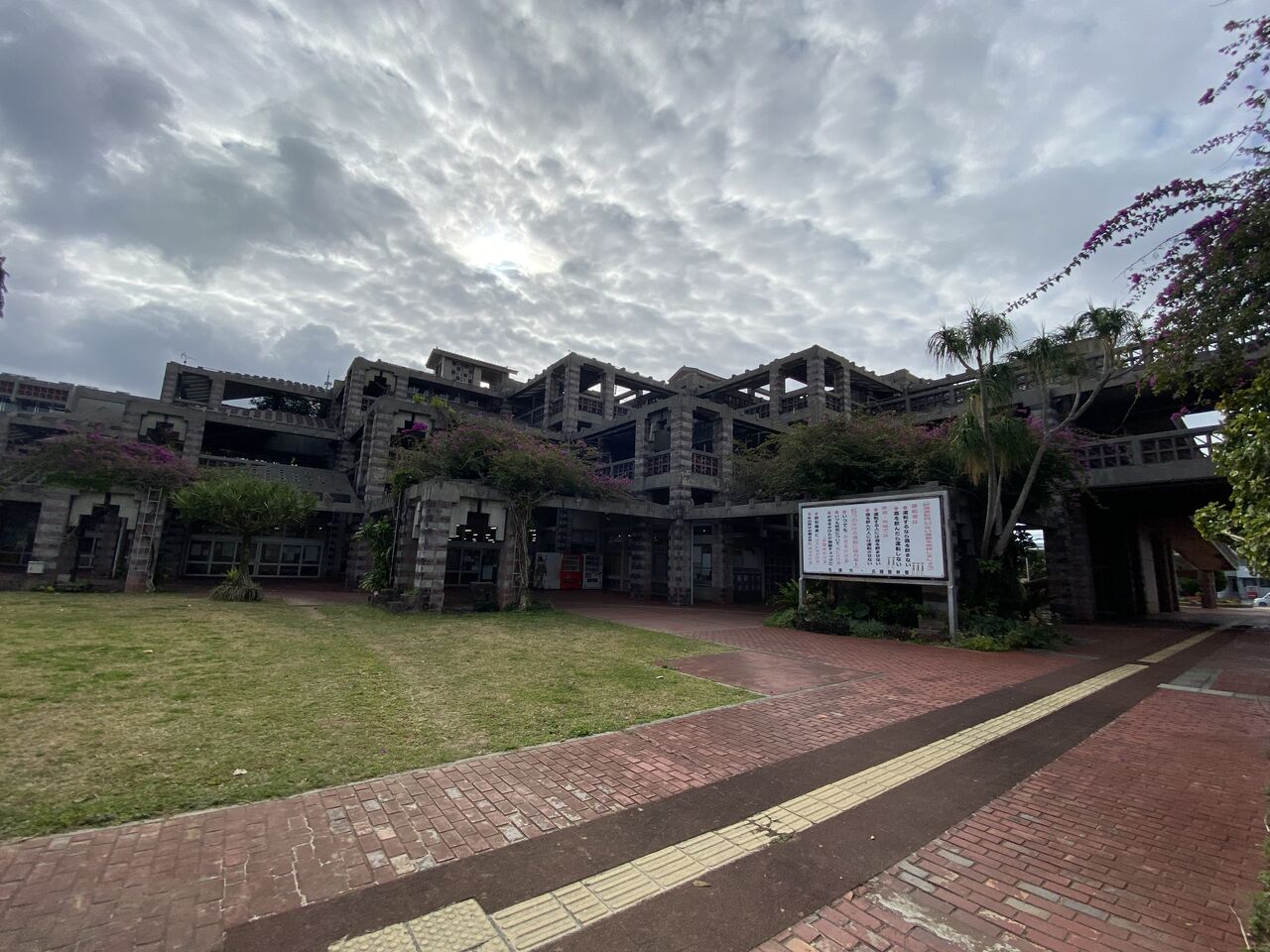 バルコニーとピロティの面積が広く、建物のほとんどが屋外。風が通り抜けるために通気性のある沖縄特有の花ブロックが使用されたり、テラスの屋根はレンガが完全にふさがれておらず通気性がある。この建築も沖縄の風土にあわせてつくられています。所々に正方形のカラーガラスを施しており、かわいらしさもある。