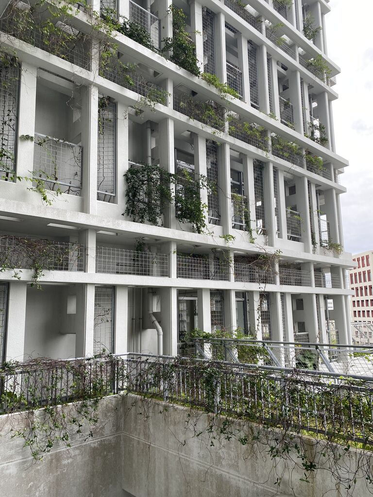 沖縄の強い日差しの負荷を低減するため、また省エネのために施された壁面緑化と屋上緑化。沖縄も冬なのでさすがに緑は少ないですが・・・