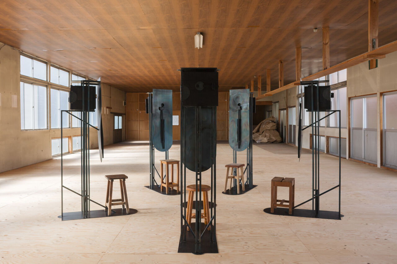 5つの椅子付きのカメラは円状に向かい合い、お互いに写真を撮り合います。ただし、5体が均等に円状に並ぶならばどのハコも正対はしません。ハコ、そして椅子に座るかもしれない誰かの視線は、多少の余白を持って交錯することになると思います。複数のモノが中心へ向かい、と同時にそのまますれ違い続けるかもしれませんが、一堂に会する一刻の場面(といっても撮影には室内だと10時間ほどかかるのですが)を、5つのハコの針穴から覗き見ようとしています。