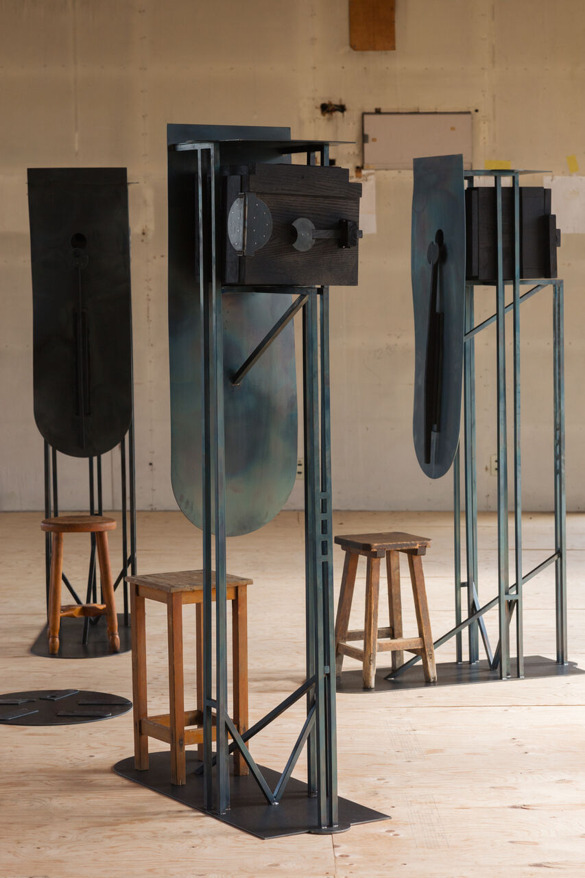 そんな改めての発見と印象を携えて、カメラの木箱と鉄の架台を5つ作っています。タイトルはひとまず、「仮面と連担」、あるいは「連なるためのハコと架台1,2,3,4,5」としています。