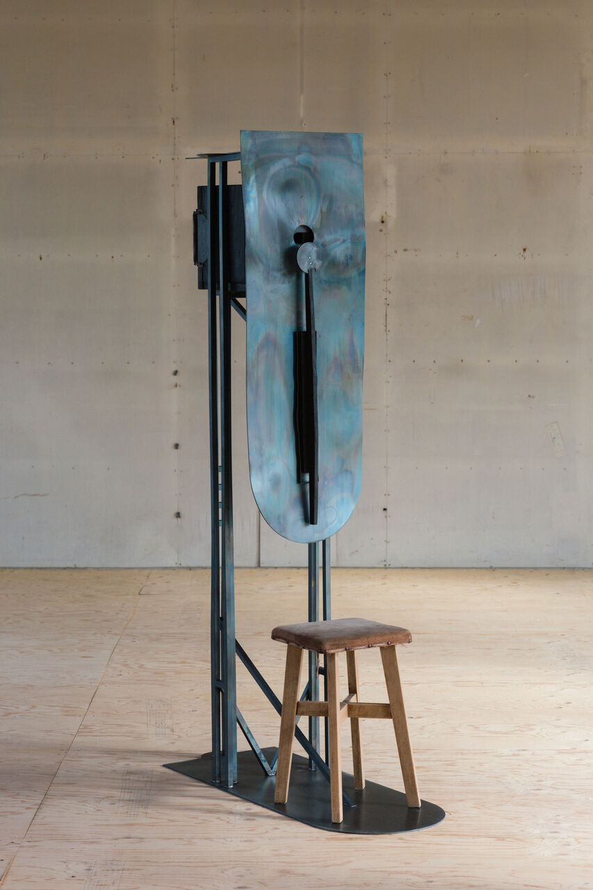 少し高い架台の上にカメラの木箱を置きます。少し引いてみれば、高い鉄塔の上の物見小屋のように見えるかもしれません。ハコは架台の正面からは姿が見えず、小さく開けた丸い穴からこちらを覗いています。ハコからの視線の下に、小さな椅子が置かれ、人が腰掛ける事ができます。