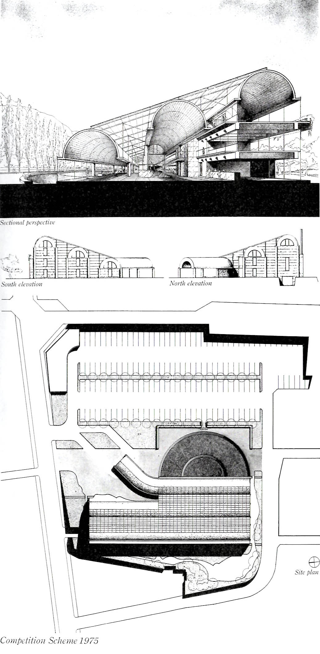 最終的にプロポーザル案は「かまぼこ倉庫」のようだと住民に拒否され、まったく別の案へと収斂していく。最終案(fig.5, GA Architect 6より)について磯崎自身は「施主の意見に素直に従った自然のなりゆきの結果にすぎない」と述べたとされるが、住民や関係者、所員とのやり取りで形態を変更していきながら、自身は概念的なことに考えを巡らしていただろうことは想像がつく。