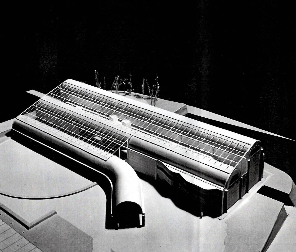 神岡町役場プロポーザルは案を選ぶコンペではなく、指名された5人から設計者を選び、そのご住民との対話を経て基本設計をまとめるというもので、そのためのたたき台が要求されるものだった。まずはプロポーザル案(fig.1、2、GA Architect 6より)を見てみよう。この頃の磯崎が多用していたバレル・ヴォールトが、三本並行しながら高さを変えて配置され、これらをまたいで寒冷地ゆえのガラスの大屋根が架けられている。ヴォールトの一本は端部で湾曲し、駐車場側には半円形のプラザが設けられている。