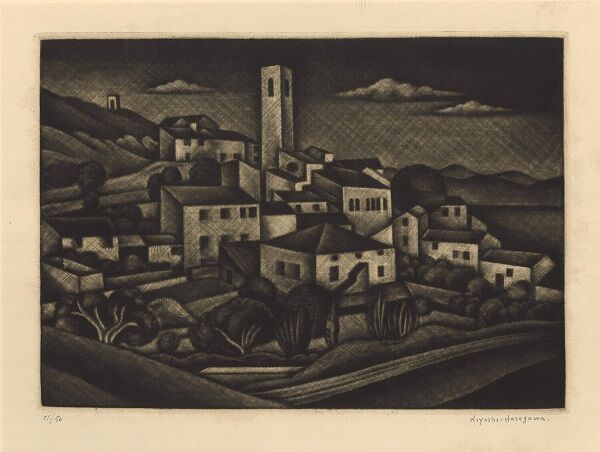 長谷川潔(1891-1980)は、20世紀の版画史にその名を刻む銅版画家です。青年時代を大正期に過ごし、日本の創作版画の草創を担った長谷川は、1918年に銅版画技法習得のためフランスへと渡り、以後帰国することなく、さまざまな銅版画の技法で制作をつづけました。とりわけ、19 世紀の写真の登場以降廃れていた銅版画技法マニエール・ノワール(メゾチント)を再興した功績は大きなもので、その静謐で深遠な作品は国際的に高く評価されています。(群馬県立近代美術館)