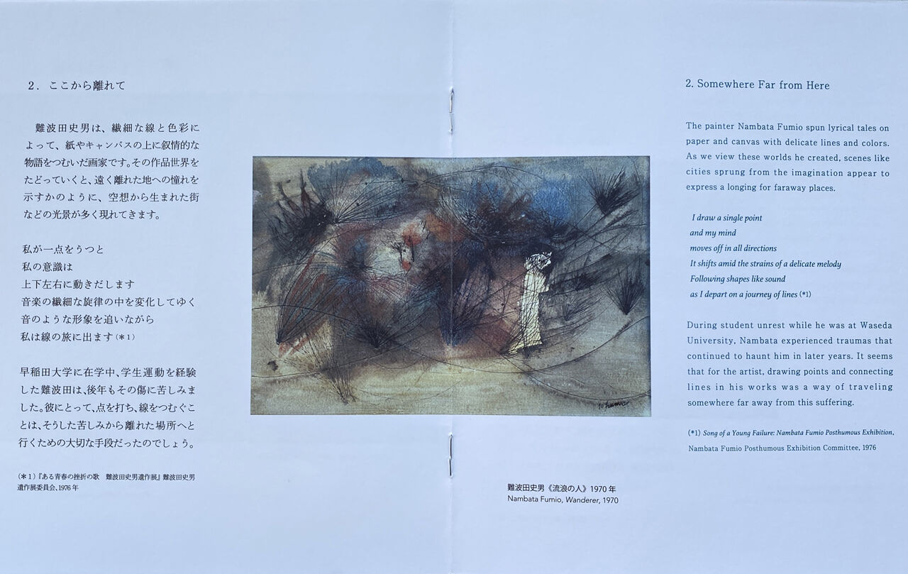 2012年、史男の実弟・難波田武男氏から同館へ龍起と史男の日記や史男の作品等が寄贈されたのに加え、後年、コレクターの寺田小太郎氏からも寄贈の申し出を受けて1)実現の運びとなったという展覧会「難波田龍起・史男の世界」の冊子。表紙に龍起作品、裏表紙(写真)に史男の作品を配し、裏表紙にはあえて展名が左右反転で印刷されている。