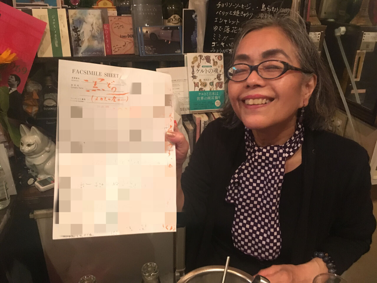 吉増さんから届いたのだというFAXを持って微笑んでいる