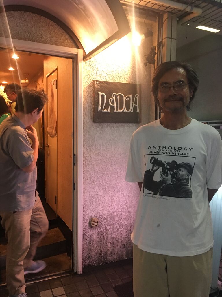 ナジャの店先での木下哲夫さん(2019年)。Anthology film archivesのTシャツを着ている。
