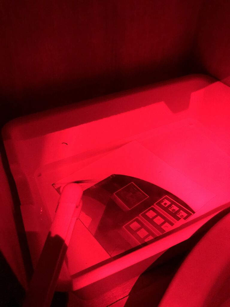 (地下駐車場での暗室作業。展示会場が映り込んだ写真を現像した)